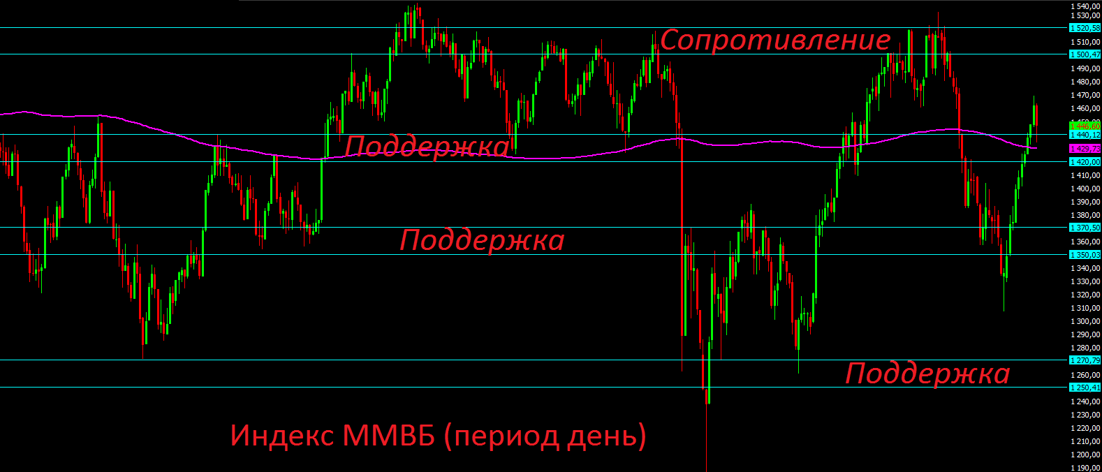 Если посмотреть на более старший период, то и там пока картина в пользу оптимизма. На дневном графике индекса ММВБ цене пока удалось закрепиться над важной поддержкой 1420-1440 пунктов. До тех пор пока цена по итогам дня не опустится ниже неё, можно удерживать длинные позиции или пробовать их открывать на локальных снижениях. Ближайшее сопротивление находится в диапазоне 1500-1520 пунктов, и если индексу ММВБ ещё раз удастся дойти до этого сопротивления, то там смело можно будет открывать короткие позиции. Если индекс ММВБ опустится ниже отметки 1400 пунктов, то это также послужит подтверждением разворота российского рынка вниз.