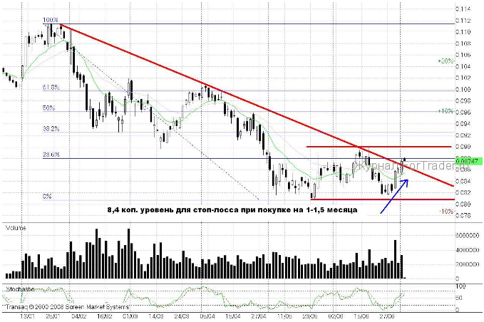 Ничего не могу с собой поделать — второй день начинаю с просмотра графика акций «ВТБ». И не страшно, что вчера они были явно не в фаворе у биржевых «быков», зато они прощупали сверху нисходящий тренд от января 2011 года. Я вижу несколько сильных сопротивлений — 8,8; 9,2 копейки. Некая пробуксовка может быть и у 9 копеек. Тем не менее, мне кажется, что государство возьмет на себя проблемы Банка Москвы, что даст толчок бумагам «ВТБ» пролететь сложные уровни, и я не удивлюсь, если в этом месяце они обозначатся даже у уровня 10 копеек. Как я говорила ранее, при покупке бумаг уровень для стоп-лосса — 8,4 копейки. Увы, сейчас сложно рассчитать риск в отношении возможной доходности. Как обычно, лучший советчик в этом плане — ваша жадность.