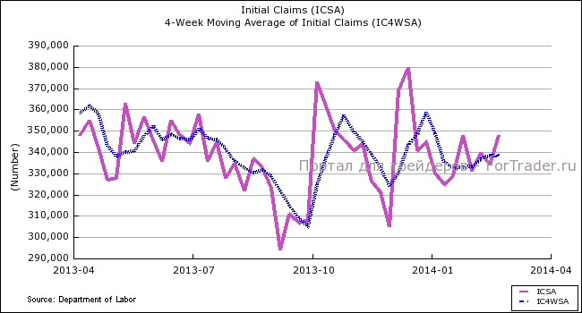 Число первичных заявок на пособие по безработице в США на прошлой неделе выросло на 14 тыс. до 348 тыс., с пересмотренных в сторону понижения 334 тыс., что оказалось хуже ожидавшихся 335 тыс. Число заявок на пособие оказалось максимальным за четыре недели. Среднее число заявок за последние 4 недели осталось неизменным, 338,25 тыс. Неблагоприятные погодные условия в США ослабили восстановление рынка труда и рынка жилья, что вероятно, понизит темпы роста экономики в первые два месяца этого года.