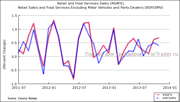 Рост был вызван во многом увеличением продаж автомобилей на максимальные за пять месяцев 1,8% — без их учета базовые продажи выросли на 0,4% м/м, превысив ожидания роста на 0,2%. В ноябре увеличились продажи 8 из 13 основных категорий розничных товаров, что может свидетельствовать об успешном старте рождественского сезона распродаж в США. Рост потребительских расходов, на долю которых приходится более 2/3 ВВП, является признаком укрепления экономики в 4-ом квартале и может приблизить сроки начала сокращения QE3.