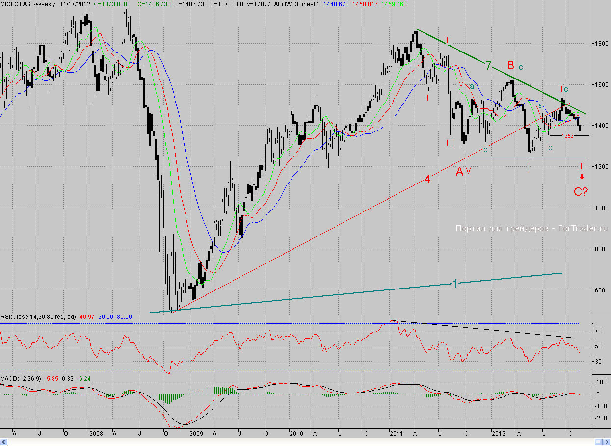 С технической точки зрения минусом для «быков» является и то, что на дневном графике по индикаторам нет «бычьих» дивергенций, при этом обе кривые MACDа находятся в отрицательной зоне и направлены вниз. Да и недельный график не радует – на позапрошлой неделе 5-недельная средняя скользящая МА пересекла сверху вниз 20-недельную. Так что все предпосылки на стороне «медведей», и если они не упустят своей ведущей роли, которую захватили два месяца назад, то они смогут неплохо разгуляться. И ближайшей целью станет район июльского минимума «b» (1353 п.), там же находится и уровень 62%-ной коррекции от роста с конца мая. И теперь этот рубеж станет ключевым, ведь в случае сдачи его «быками», на росте, наблюдаемом с конца мая, можно будет поставить крест. И тогда актуальным будет район минимумов за последние два года (1230-1250 пп.).