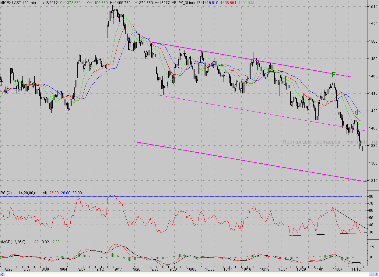 Исследуя 2-часовой график индекса ММВБ, видим, что открывшись с гэпом вниз, котировки продолжили снижение и преодолели нижнюю границу падающего канала и предыдущий локальный минимум. Ближе к полудню быки попытались организовать отскок, однако единственное чего они смогли добиться, это подтянуть цены к нижней грани. От данного рубежа «бурые» погнали «быков» дальше вниз, в результате чего утренний минимум был уверенно преодолен, и котировки с небольшими отскоками снижались вплоть до закрытия торгов. Таким образом, покупателям за последние два дня не только не удалось организовать хоть какой-то значимый отскок, но и удержаться на нижней границе падающего канала, которая теперь стала средней линией, о чём мы писали два дня назад.