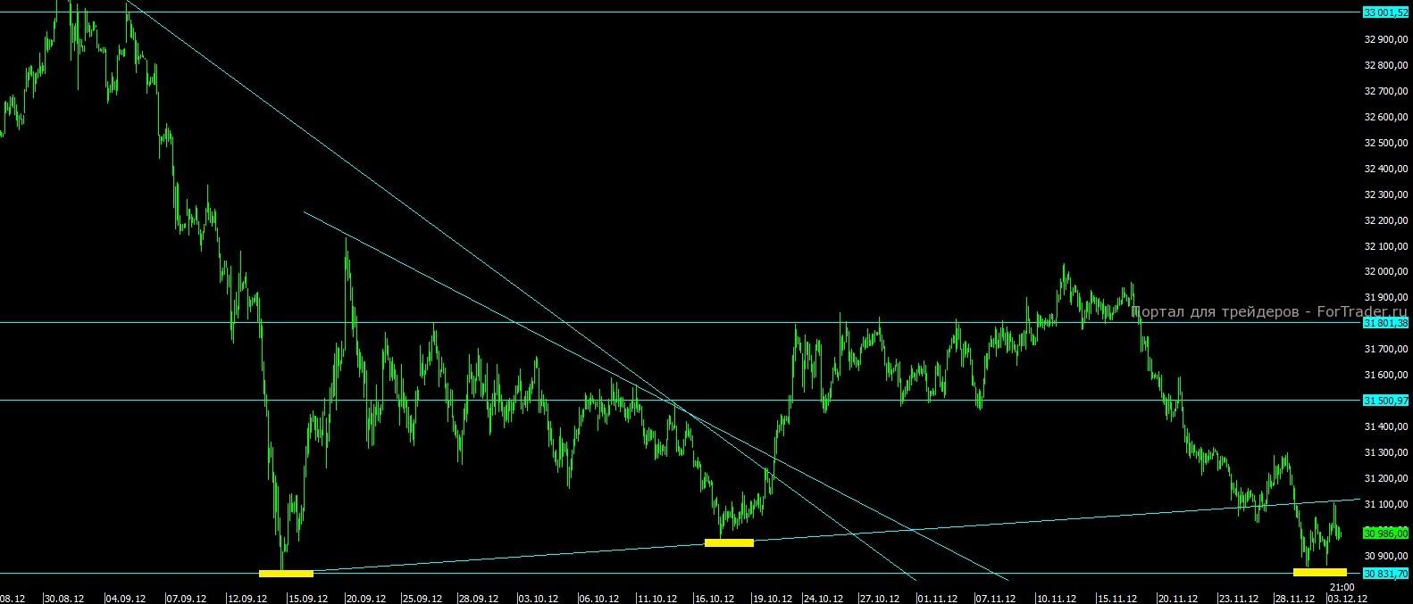 Второй день подряд рубль показывает незначительную слабость. Мы видим, что по данному инструменту устоял важный горизонтальный уровень на отметке 31830 пунктов, после чего цена пошла вверх, оттестировав сопротивление на отметке 31100. В текущей ситуации есть все шансы на пробой вчерашнего сопротивления и выход к более высоким значениям.