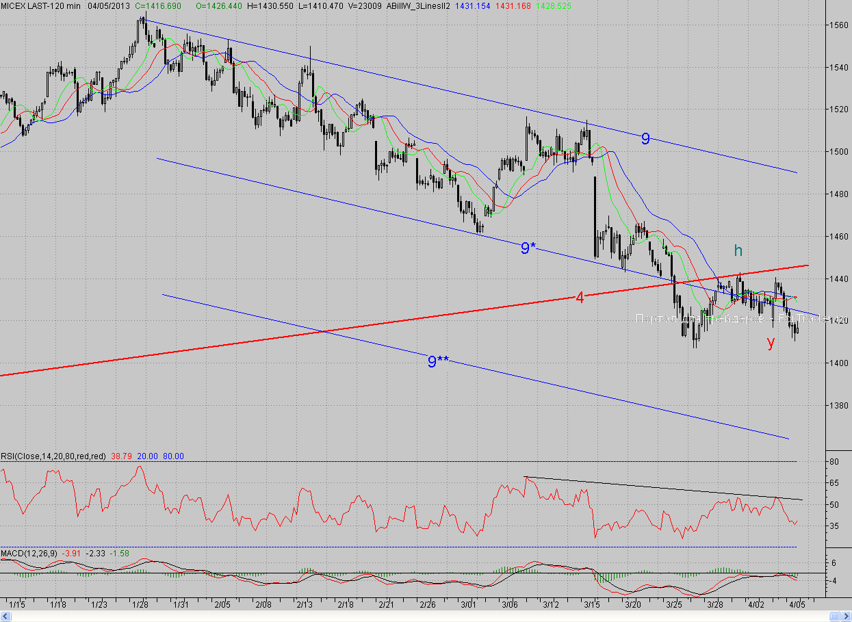 Исследуя 2-часовой график индекса ММВБ, видим, что открывшись на тех же уровнях, котировки продолжили падение, начатое днём ранее. В результате были уверенно преодолены не только ближайшая поддержка в лице средней линии (9*) среднесрочного падающего канала (9-9**), но и более серьёзная в лице 2-часового фрактала на продажу Y (1417,2 п.). Тем не менее, при подходе к мартовскому минимуму (1407,2 п.) «медведи» стали притормаживать, несмотря на то, что негатив на мировых рынках продолжался. А стоило фьючерсам на американские индексы под вечер начать подрастать, как и у нас произошёл отскок, обусловленный, в частности, и закрытием коротких позиций перед выходными.