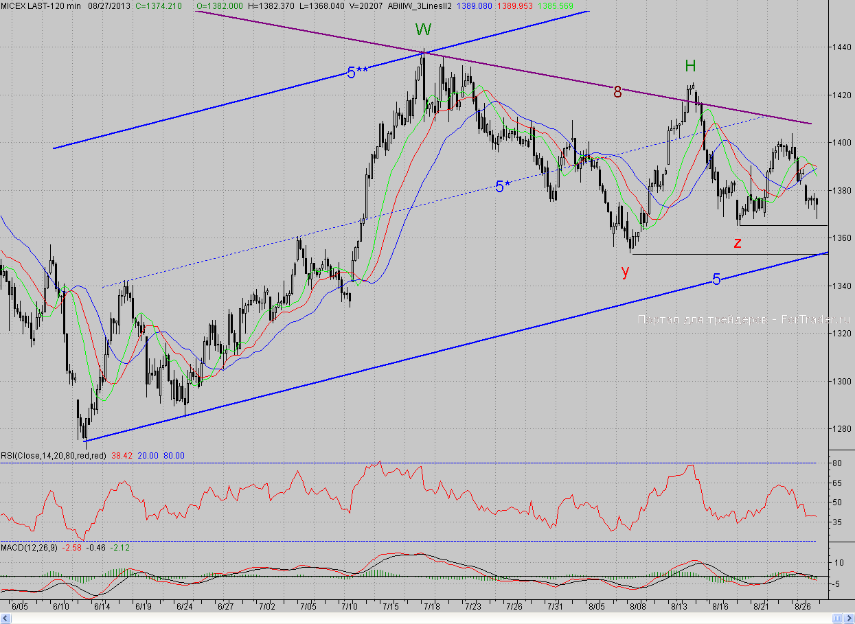 Исследуя 2-часовой график индекса ММВБ, видим, что на негативном внешнем фоне открывшись с гэпом вниз, дальнейшего снижения практически не последовало. Более того котировки попытались подрасти. Однако бычий энтузиазм быстро сошел на нет, и медведи возобновили прессинг, который с негативным открытием американского рынка усилился. Но под занавес торгов в районе дневного фрактала на продажу Z (1 365,28 п.) прошли покупки, и день завершился не в столь большом минусе (0,9%)