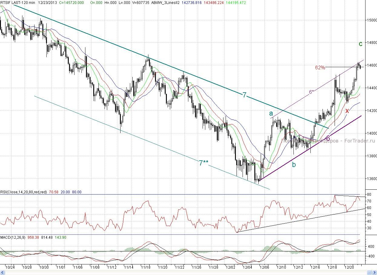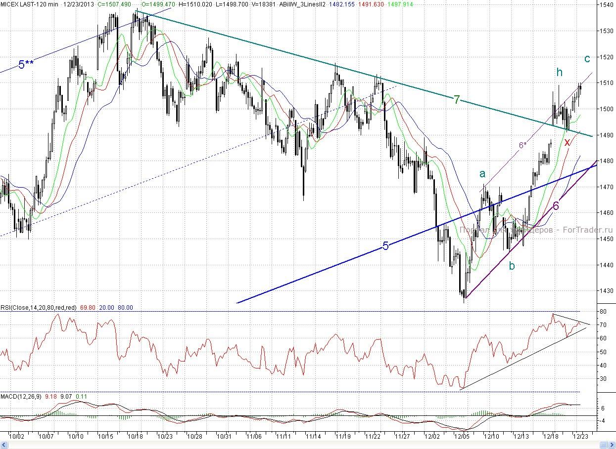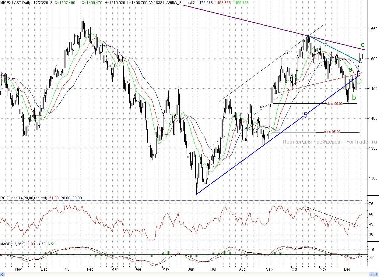 Таким образом, покупатели продолжили развивать наступление и котировки вплотную подошли к цели роста, которой выступает район 1 520п. (длина волны С с расширением 1,62) Здесь же проходит и долгосрочный падающий тренд с апреля 2011 г. А для фьючерса на индекс РТС это район 147 700п.
