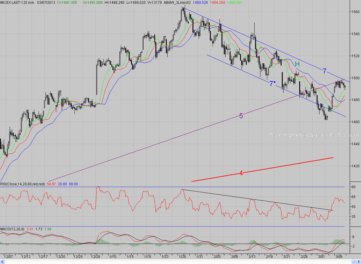 Исследуя 2-часовой график индекса ММВБ, видим, что открывшись на тех же уровнях, котировки попытались подрасти. Однако довольно быстро цены вновь столкнулись с сильным сопротивлением в лице кластерной зоны, в которой проходят среднесрочные растущий (5) и падающий (7) тренды, а также находится предыдущий локальный максимум (1496,6 п.). От данного района начались продажи, но они были несильными, и единственное, чего добились «медведи», это вернули себе всё отвоёванное «быками» утром.