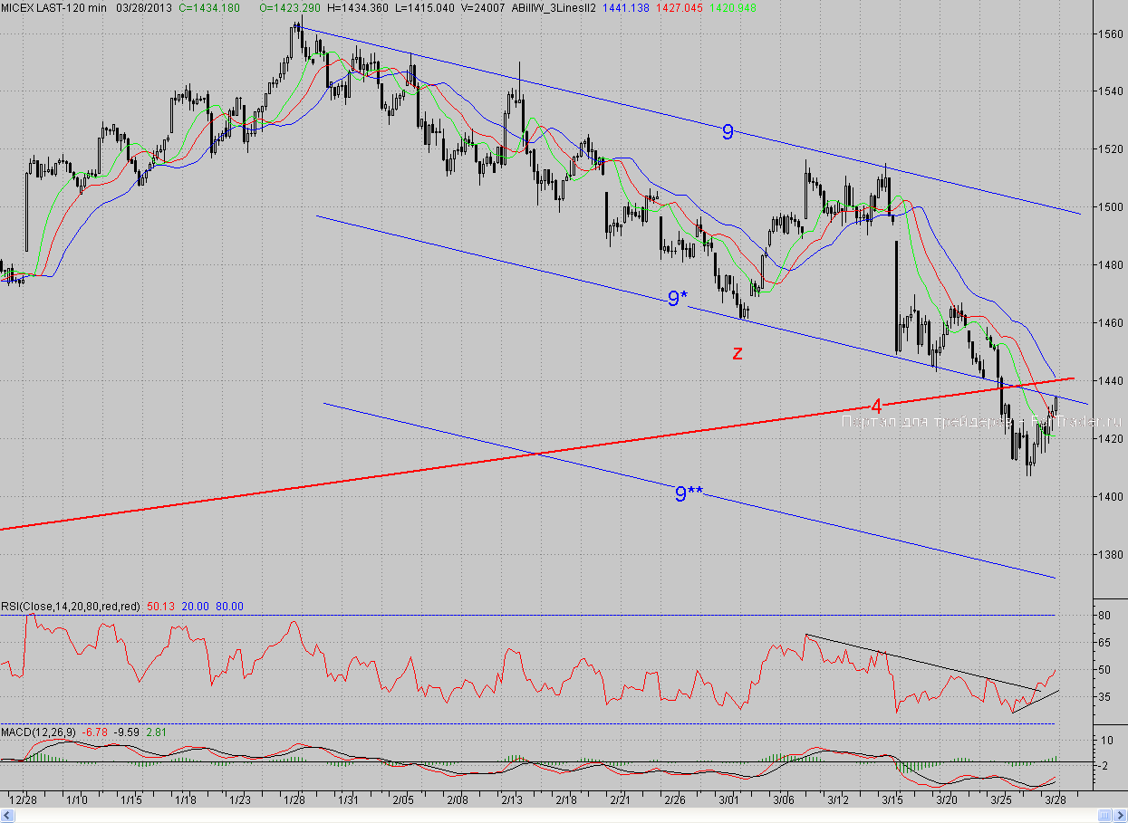 Исследуя 2-часовой график индекса ММВБ, видим, что утреннее небольшое снижение, обусловленное умеренно-негативным внешний фоном, довольно быстро закончилось, и цены возобновили отскок, начатый днём ранее. Однако «медведи» явно сопротивлялись, что отражалось постоянными просадками цен. И тем не менее, «быки» сумели удержать с таким трудом вырванную у «бурых» инициативу и продолжали отыгрывать потери первой половины недели. В итоге котировки добрались до значимого сопротивления в лице средней линии (9*) падающего канала (9-9**), и день закрылся на максимальных значениях.