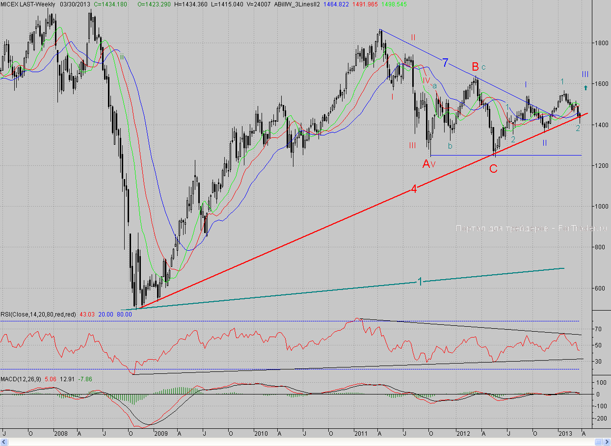 Таким образом, количество Мюнхгаузенов, пытающихся вытащить «бычье» войско из ямы, стало больше, в результате чего рынку удалось отыграть уже почти половину от последней волны падения. А если бы во всеобщем росте участвовал и Газпром, то результат был бы ещё лучше. Теперь же покупателям предстоит основная задача контрнаступательной акции – вернуть себе ключевой рубеж в лице долгосрочного растущего тренда (4). Пару дней назад мы писали, что важно недельное закрытие. Ведь только в случае возвращений цен на этот тренд можно будет говорить о ложности пробоя данной 4,5-летней направляющей и возможности для «быков» возобновить поход на Север после 2 месяцев отступления.