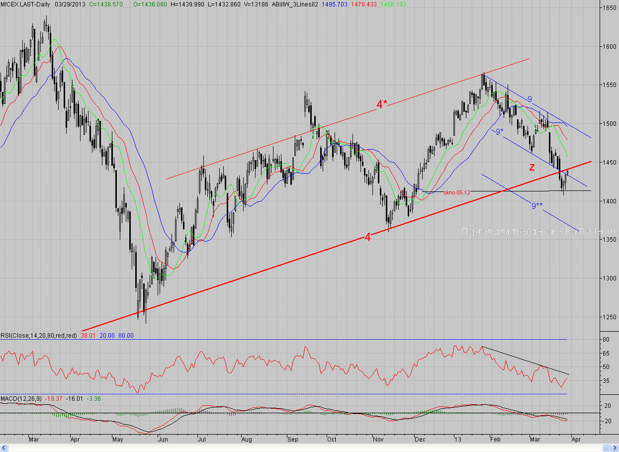 Таким образом, «быки» попытались осуществить свою ключевую задачу по отвоеванию тренда (4). Однако даже с учётом неработающих мировых рынков и окончания квартала, что должно было бы помочь покупателям, сделать им это не удалось. Сегодня же на умеренно-негативном внешнем фоне «быкам» и вовсе придётся держать оборону, по крайней мере, с утра. В роли ближайшей поддержки выступит и пятничный минимум и линия (9*), а далее – минимум четверга (~1415 п.). При этом напомним, что основной целью «медведей» является район осенних минимумов прошлого года (~1360 п.). За этот сценарий говорит дневной график, на котором по индикаторам отсутствуют дивергенции.
