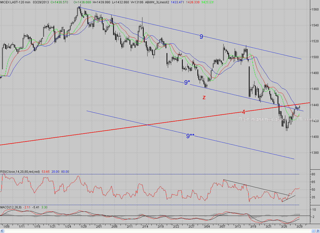 Исследуя 2-часовой график индекса ММВБ, видим, что открывшись с небольшим гэпом вверх, котировки сразу оказались в районе основного сопротивления в лице долгосрочного растущего тренда (4), с которого «быки» были сброшены в начале недели. Как и ожидалось, засевшие на данном рубеже «медведи» прорычали и начали отгонять «быков» от тренда. Однако утреннее окошко и средняя линия (9*) среднесрочного падающего канала (9-9**) поддержали цены, а под вечер котировки и вовсе возобновили рост, в результате чего день закрылся на максимуме.