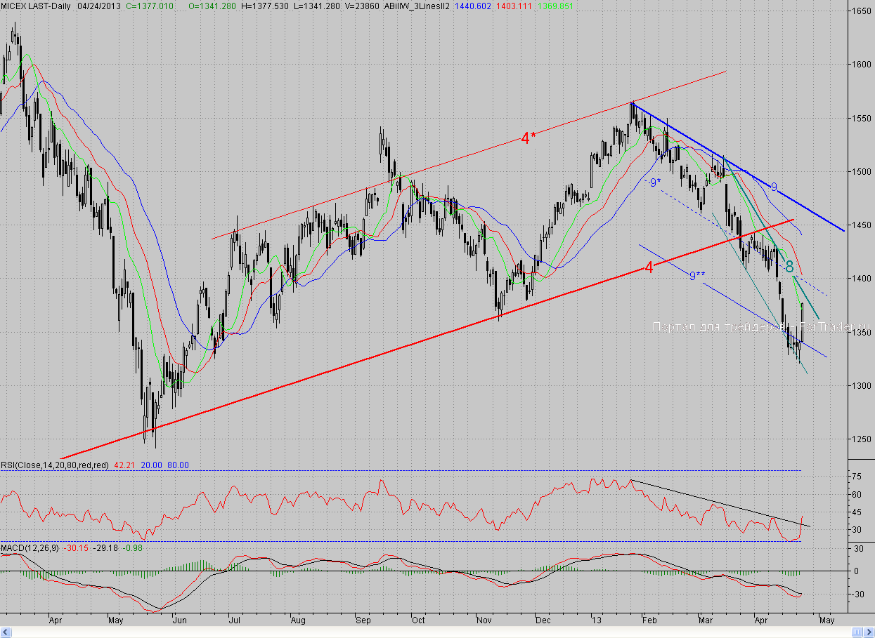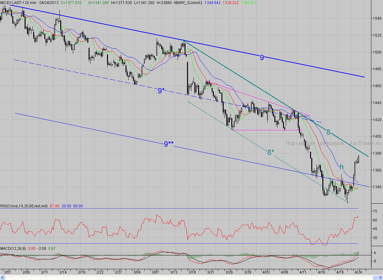 Исследуя 2-часовой график индекса ММВБ, видим, что на позитивном внешнем фоне котировки открылись с гэпом вверх и начали уверенно набирать высоту. В результате ближайшее сопротивление в лице нижней границы среднесрочного падающего канала (9-9**) была быстро преодолена, и цены пошли выше. Не спас «медведей» и более значимый редут обороны в лице 2-часового фрактала на покупку h (1354,8 п.). После его преодоления рост усилился и в целом продолжался вплоть до закрытия. В итоге индекс показал наилучший результат в этом году и закрылся на максимуме.