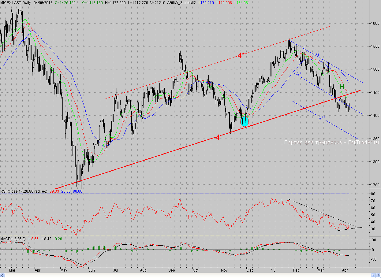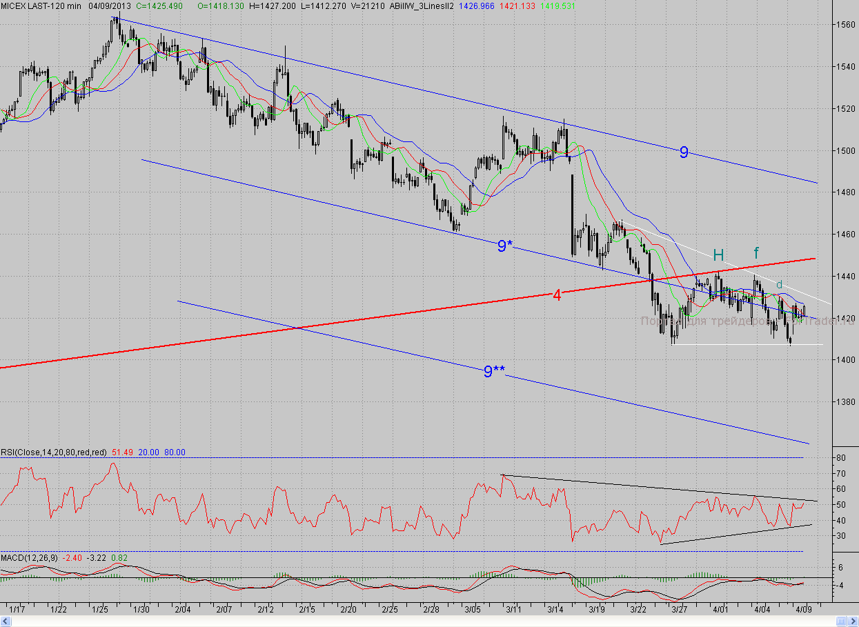Исследуя 2-часовой график индекса ММВБ, видим, что на позитивном внешнем фоне открывшись с гэпом вверх, котировки немного снизились, после чего начали набирать высоту. В результате этого к полудню покупатели отвоевали среднюю линию (9*) среднесрочного падающего канала (9-9**). Однако на этом «бычий» запал иссяк, и цены, не дойдя до следующего сопротивления в лице 2-часового фрактала на покупку d (1430,5 п.), вновь испытали давление «мишек». Правда, и оно было несильным, и котировки в целом удержались на линии (9*). А под вечер рост возобновился, и день закрылся почти на дневном максимуме.