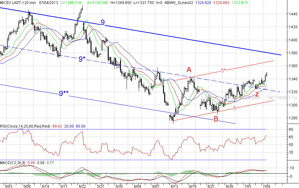 Напомним, что пока весь рост последних трёх недель носит характер коррекционного, и хотя вчера поступил ключевой сигнал на покупку (пробит дневной фрактал), но праздновать победу «быкам» ещё рано – для большей уверенности в том, что среднесрочная понижательная волна завершена, ценам надо преодолевать и падающий тренд (9). При этом покупателям не стоит забывать про оборону: ближайшей поддержкой на сегодня будет уровень преодоленного вчера фрактала А (~1340 п.), более серьёзной зацепкой станет средняя линия (9*) канала (9-9**) и 2-часовой фрактал на продажу Z (1324,3 п.).