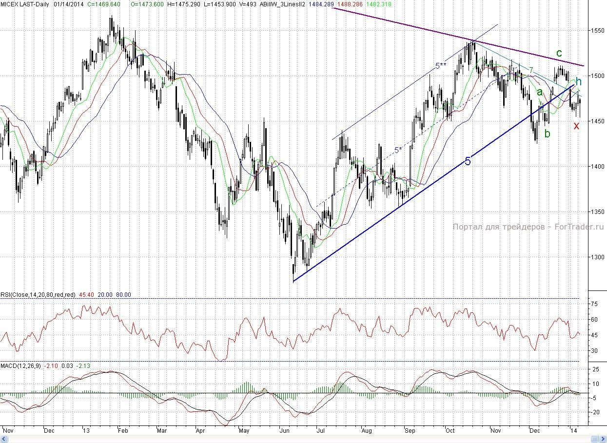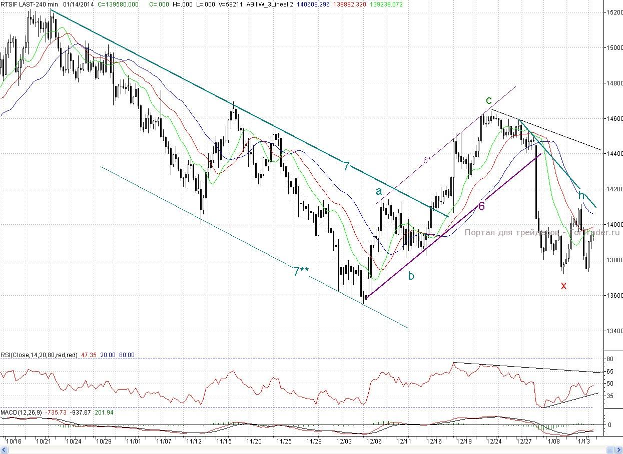 С технической точки зрения по техническим индикаторам образовались уже двойные бычьи дивергенции, но индекс ММВБ и по 2- часам и по дням по Б. Уильямсу находится все еще вне позиции. Так что ситуация по прежнему остается пограничной, но подача теперь на стороне покупателей. И сегодня на позитивном внешнем фоне уже быки будут экзаменовать медведей, которым необходимо удержать максимум понедельника h (1 482,44 п.), ставший 2 — часовым фракталом на покупку. По фьючерсу на индекс РТС это 141 140п. Ближайшим же сопротивлением выступит «старый» падающий среднесрочный тренд (7). Так что торги снова обещают быть интригующими.