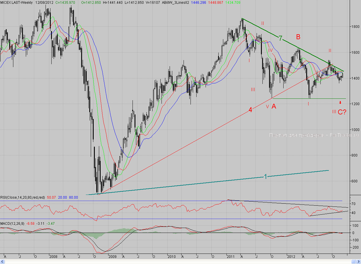 Таким образом, покупатели перешли к решительным действиям, и цены вплотную подошли к ключевому редуту медвежьей обороны в лице долгосрочного падающего тренда (7), берущего своё начало с апрельского максимума прошлого года. Полагаем, что в этом районе быки поумерят свой пыл, да и медведи будут более агрессивными. Ведь в случае сдачи этого рубежа растущее движение продолжится с новой силой. С технической точки зрения образовалась потенциальная медвежья дивергенция по RSI и гистограммному MACDу. Правда при сильном росте или падении этот фактор часто игнорируется игроками. Посмотрим, как будет на этот раз.
