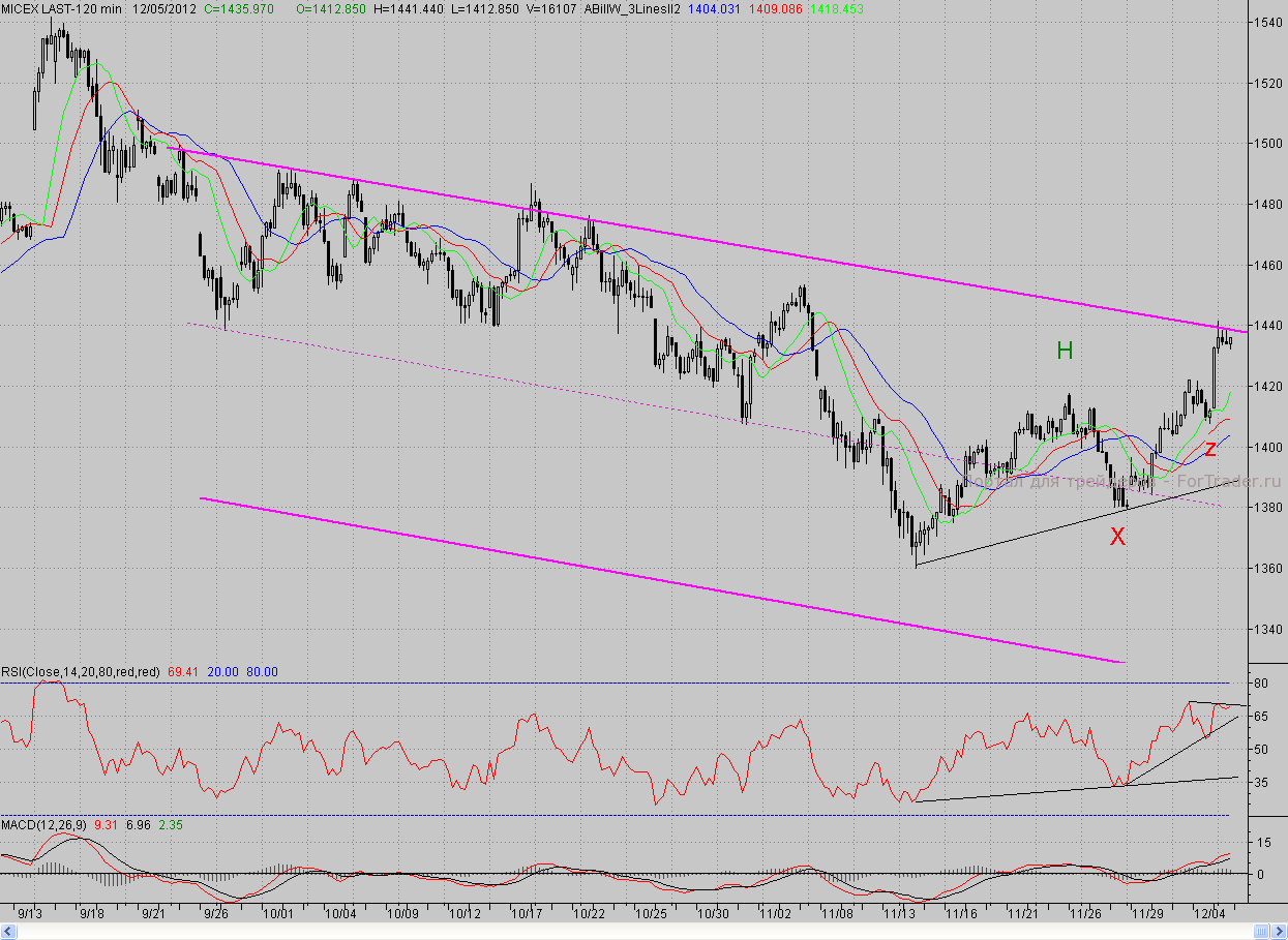 Исследуя 2-часовой график индекса ММВБ, видим, что на позитивном внешнем фоне котировки открылись с гэпом вверх и уверенно продолжили рост, начатый ещё на прошлой неделе. На какое-то время ближайшее сопротивление в лице максимума понедельника (1422,2 п.) приостановило «быков», но оптимизма в их глазах было так много, что данный уровень был быстро покорён. После этого поход на Север продолжился, и только район верхней границы среднесрочного падающего канала сумел остановить «бычье» наступление, хотя в моменте он и прокалывался. У данного рубежа котировки проторговались всю оставшуюся сессию. В результате день закрылся почти на максимуме.