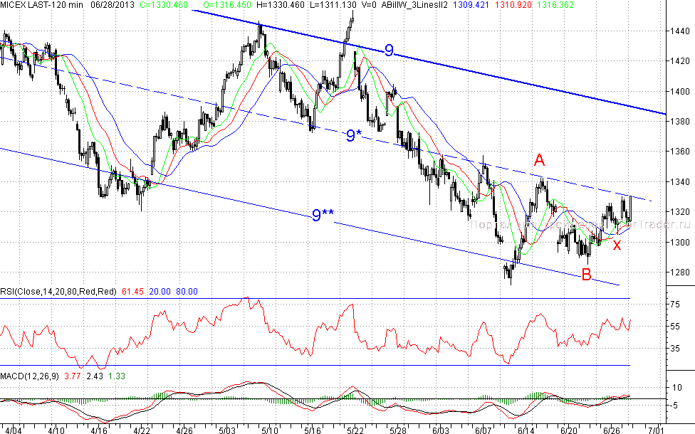 Исследуя 2-часовой график индекса ММВБ, видим, что открывшись на позитивном внешнем фоне с небольшим гэпом вверх, котировки стали уверенно набирать высоту и без труда преодолели ближайшее сопротивление в лице района максимумов предыдущих двух дней (~1325 п.). После этого движение на Север продолжилось, однако покорить более серьёзный рубеж «медвежьей» обороны в лице средней линии (9*) среднесрочного падающего канала (9-9**) «быкам» не удалось – напротив, от данного района начались продажи, и рынок потерял всю набранную за утро высоту. Тем не менее, дальнейшего отступления «быков» не произошло – на утреннем окне (~1312 п.) они собрались с силами и вновь пошли в атаку, чему во многом способствовали начавшие подрастать фьючерсы на американские индексы. В итоге цены снова оказались в районе дневного максимума, и только закрытие торгов не позволило «быкам» преодолеть линию (9*) – ведь после окончания нашей сессии заморские площадки продолжали набирать высоту.