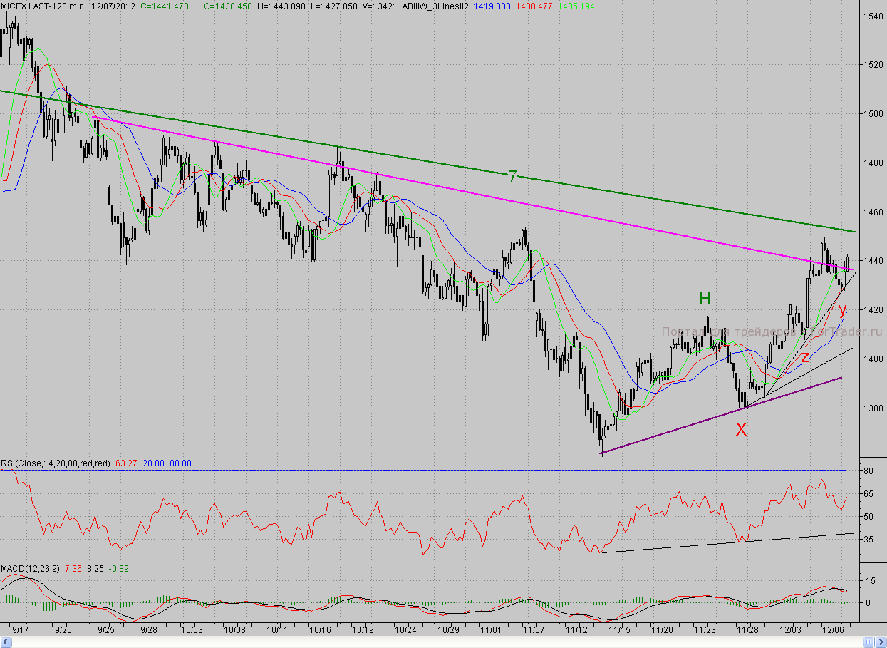 Таким образом, «быки» отлично справились с задачей пятницы и, несмотря на снижение первой половины сессии, сумели завершить и день и неделю практически на максимальных значениях. Так что предпосылки для дальнейшего наступления созданы. Однако, как мы писали в пятницу, для продолжения роста покупателям необходимо преодолевать ключевое сопротивление в лице долгосрочного падающего тренда (7), берущего своё начало с апреля 2011 года. А поскольку редут всё же серьёзный, то перед его атакой неплохо бы «быкам» поднакопить силы. Но как показала пятница, они не очень-то настроены отступать. С одной стороны, это говорит о силе «быков», но с другой – это может негативно сказаться для них в случае если тренд (7) не будет взят – ведь в этом случае падение может быть более сильным. Ближайшей поддержкой вступит краткосрочный растущий тренд, а далее – пятничный минимум, он же потенциальный 2-часовой фрактал на продажу Y (1427,8 п.). Более важным будет предыдущий локальный минимум Z (1407,9 п.).