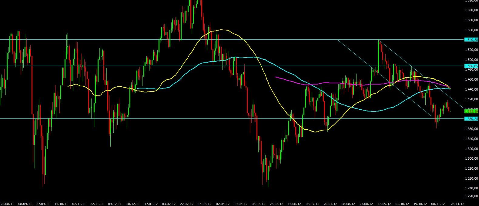 Индекс ММВБ по прежнему находится в понижательном канале и пока есть все шансы увидеть вновь пробой в ближайшие дни важной технической отметки 1380 пунктов, который может привести к более серьёзной коррекции. Если учесть тот факт, что тема с “фискальным обрывом” в США вновь начнёт обсуждаться только в следующий вторник, то можно сделать выводы, что до конца недели мы можем вполне увидеть боковую и понижательную динамику по индексам, в связи с чем не советую заходить в рынок долгосрочным и среднесрочным инвесторам.