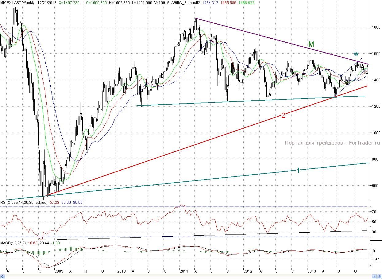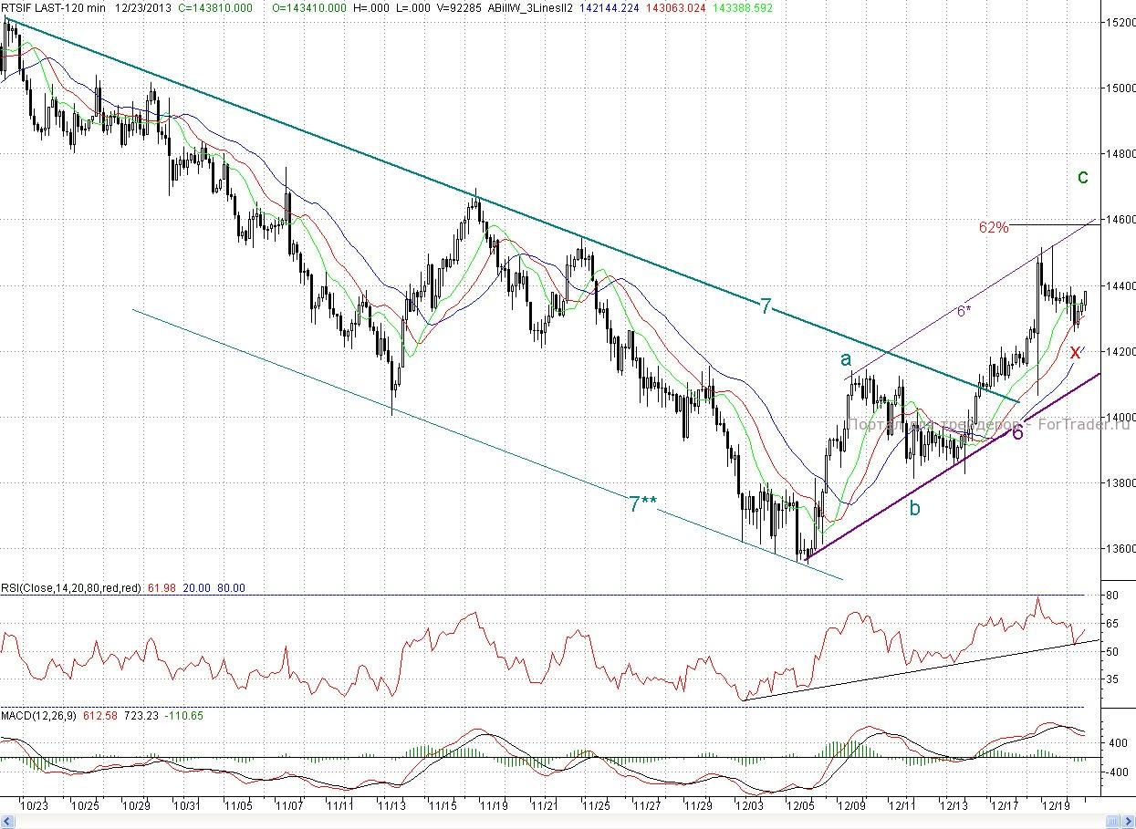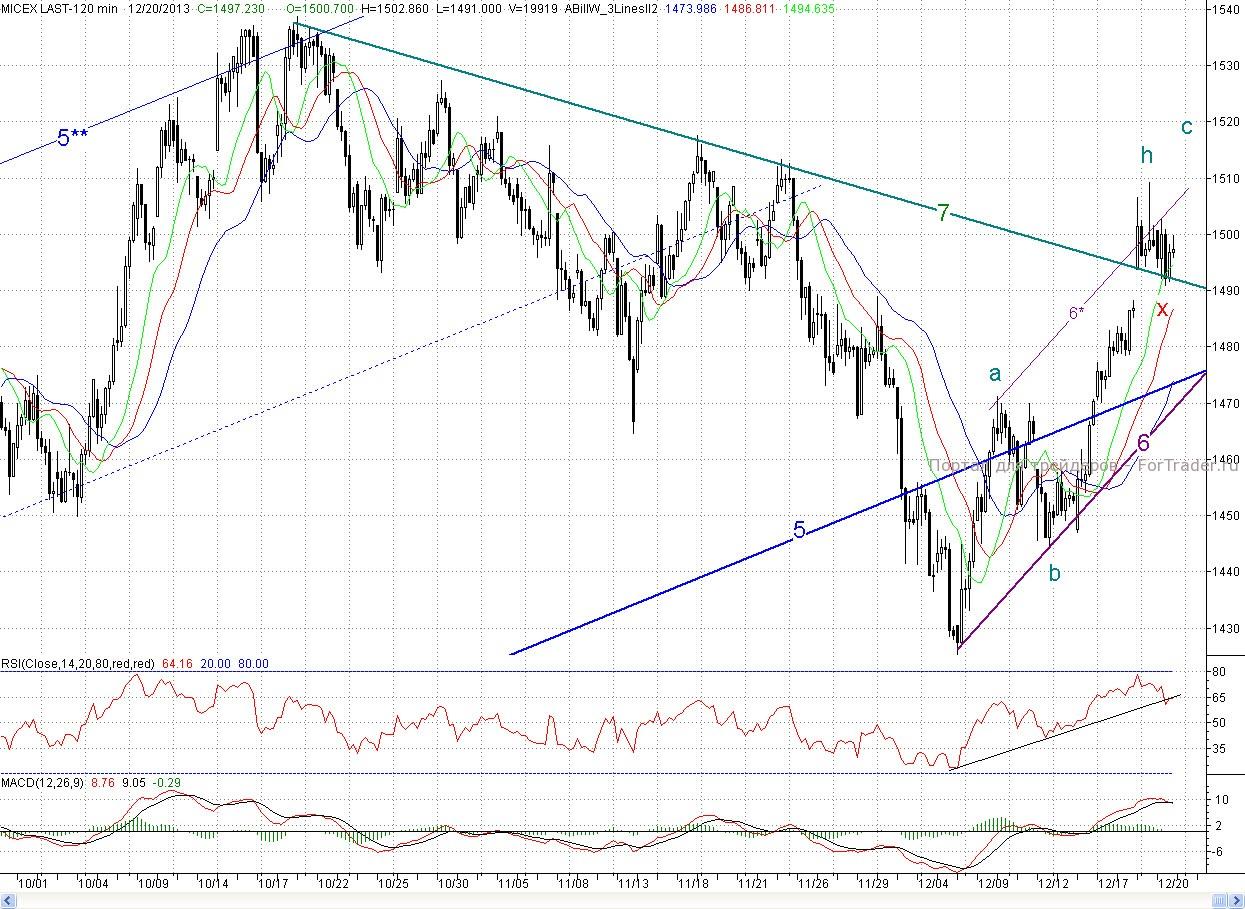 Таким образом, покупатели успешно справились с дневной задачей, и неделя закрылась довольно благоприятно для них, что дает основания для продолжения роста. А учитывая то, что торги, начиная со среды, будут проходить без влияния западных площадок, то мешать ему будет и некому. К тому же и техника играет на стороне покупателей. Индекс ММВБ и по 2- часам и по дням находится в покупке. При этом медвежьих дивергенций пока не образовалось. Напомним, что теперь целью роста выступает район 1 520п. (длина волны С с расширением 1,62) Здесь же проходит и долгосрочный падающий тренд с апреля 2011 г. А для фьючерса на индекс РТС это район 147 700п. Роль ближайшего сопротивления снова сыграет верхняя граница канала (6-6*), а далее максимум четверга h (1 509,15 п.). Ближайшей поддержкой выступит среднесрочный падающий тренд (7) и пятничный минимум Х (1 491 п.), а далее незакрытое окно четверга.