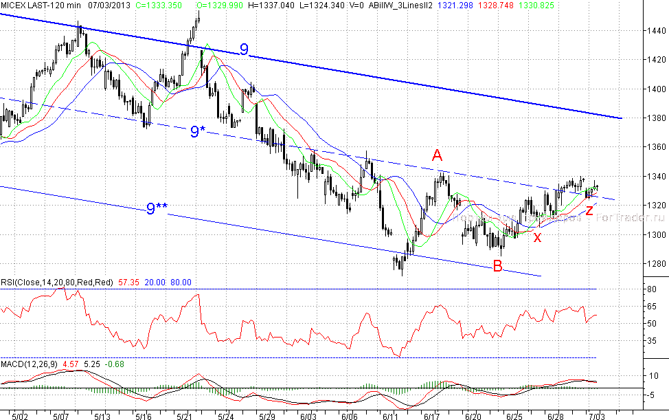 Исследуя 2-часовой график индекса ММВБ, видим, что открывшись на негативном внешнем фоне с гэпом вниз, котировки продолжили движение на Юг и прокололи ближайшую поддержку в лице средней линии (9*) среднесрочного падающего канала (9-9**). Однако агрессии в действиях «медведей» не было, да и «быки» понимали, чем им грозит потеря данного рубежа, и постарались поскорее вернуть цены выше линии (9*). Во второй половине торгов теперь уже покупатели попытались завладеть ситуацией и возобновить рост, но единственное чего им удалось сделать, это закрыть утреннее окно, после чего произошёл небольшой откат вниз, и в итоге день закрылся в небольшом минусе.