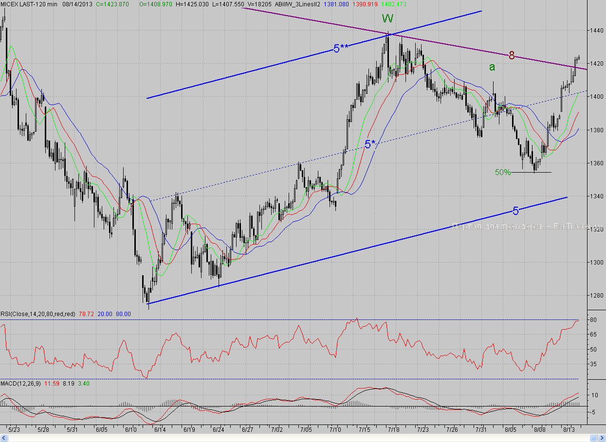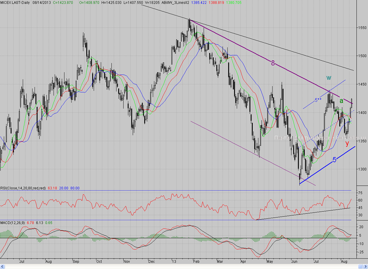 И с технической точки зрения картина за 2 дня существенно улучшилась. Во вторник индекс ММВБ по фракталу A (1 409,37 п.) и по дням вошел в покупку, а вчера котировки преодолели и среднесрочный падающий тренд. Так что перспективы у покупателей хорошие. Смущает только то, что рост идет практически без откатов, и без заходной дневной растущей волны. Вини- Пух по этому поводу наверное сказал бы, что это какие то неправильные бычки организовали неправильный рост ☺. В этом плане сегодняшний день будет во многом показателен. Сумеют ли покупатели на негативном внешнем фоне не поддаться панике, и отступить стройными рядами? Ближайшей поддержкой теперь выступит бывшее ключевое сопротивление — уже упомянутый среднесрочный падающий тренд (8), а далее средняя линия 5* (~1 400 п.) среднесрочного растущего канала (5-5**). Более сильным редутом будет незакрытое окно вторника (~1 390 п.)