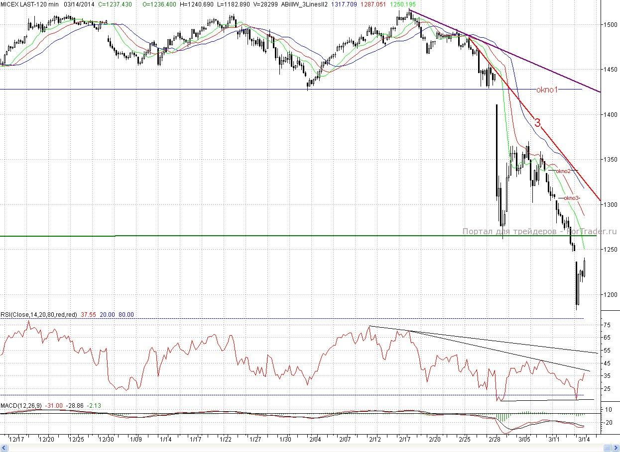 С технической точки зрения плюсом для покупателей является то, что на 2- часовом графике образовались бычьи дивергенции. Потенциальная по RSI присутствует и на дневном тайм-фрейме. К тому же дневная форма свечи очень оптимистична для покупателей и предполагает дальнейший подъем котировок. Однако неделя в целом снова завершилась негативно для них. Так что мажорное пятничное закрытие не переламывает среднесрочную минорную ситуацию. И предполагаемый рост будет рассматриваться всего лишь отскоком. А его сила будет определяться конкретными действиями со стороны Запада. Ближайшим же сопротивлением выступит бывшая поддержка – предыдущий локальный минимум от 3 марта (1 261,84 п.). Более сильным редутом будет незакрытое окно №3 от 12 марта (~1 305 п.). В этом же районе проходит краткосрочный падающий тренд (3) и уровень 38% коррекции от падения с середины февраля. Роль ближайшей поддержки сыграет утреннее окно, а далее район пятничного послеобеденного минимума (~1 215 п.)