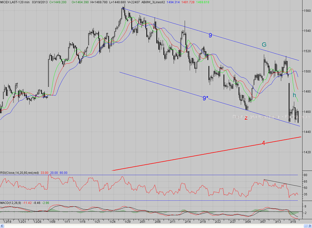 В этом случае роль ближайшего сопротивления сыграет вчерашний вечерний максимум (1462,6 п.), а далее – дневной, который стал 2-часовым фракталом на покупку h (1469,8 п.), но пока недействительным. Однако и про оборону не стоит забывать, ведь «медведи», вкусившие «бычьей» крови, будут стараться дойти до намеченной цели одним махом. Ближайшей поддержкой выступит нижняя граница среднесрочного падающего канала (9-9*), основной является тренд (4), здесь же расположен и уровень 62%-ной коррекции от всего роста с середины ноября.