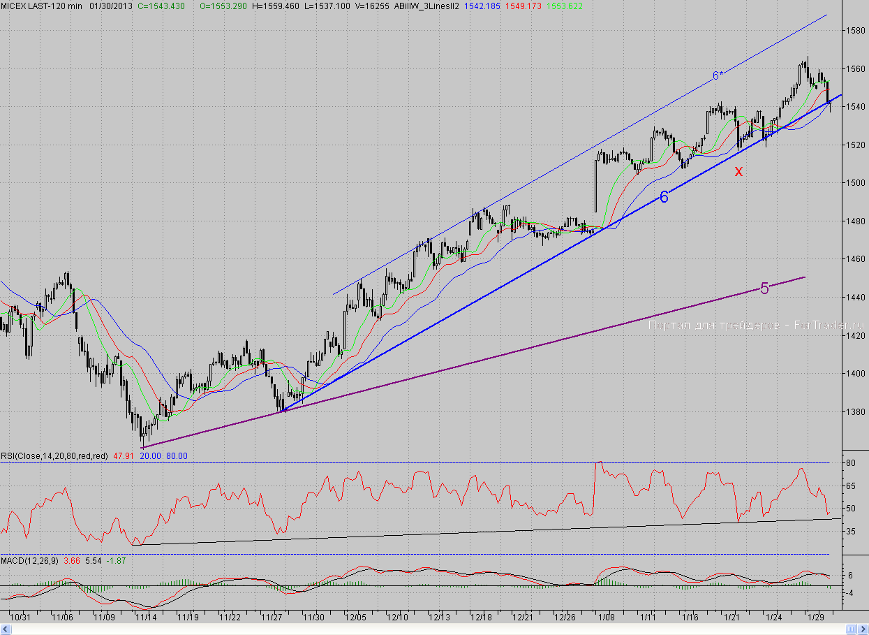 Исследуя 2-часовой график индекса ММВБ, видим, что открывшись с гэпом вверх, котировки попытались возобновить рост, прерванный днём ранее. Однако «бычьего» оптимизма хватило всего на полчаса, после чего «медведи» возобновили контратаку. Но продажи были неагрессивными, и цены плавно снижались, закрывая утреннее окно. Однако после выхода в 17:30 негативной статистики по США (данные по ВВП оказались намного хуже ожиданий) «бурые» резко усилили напор и, преодолев минимум предыдущего дня, устремились ниже. И только более сильная поддержка в лице уровня сентябрьского максимума и среднесрочного растущего тренда (6) сумела остановить цены, хотя в моменте данный район и прокалывался. В результате закрытие произошло ровно на нём.