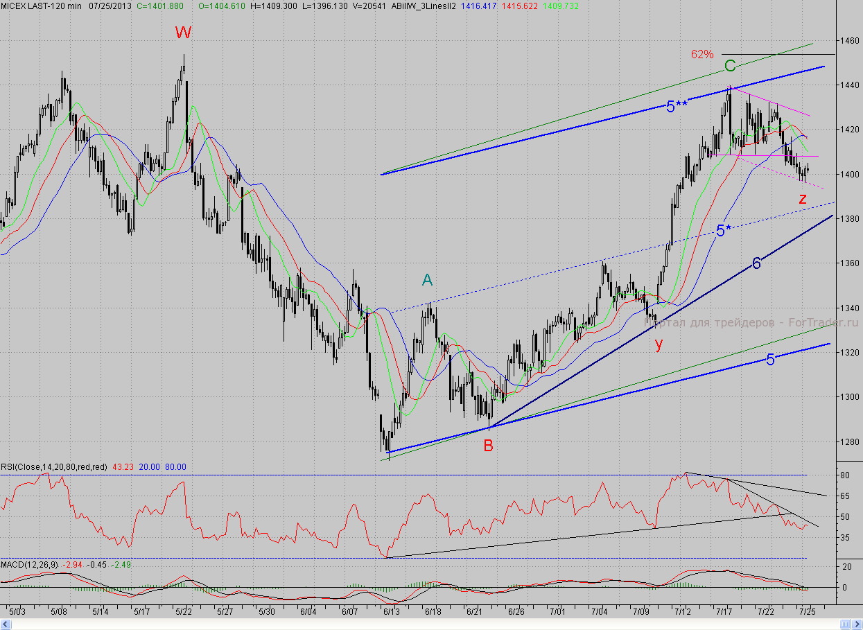 На 2 — часовом графике мы немного подкорректировали среднесрочный растущий канал (5-5**).Если среднюю линию 5* провести через «старые» локальные максимумы, то верхняя граница как раз приходится на июльский максимум С (1 439,6 п.)