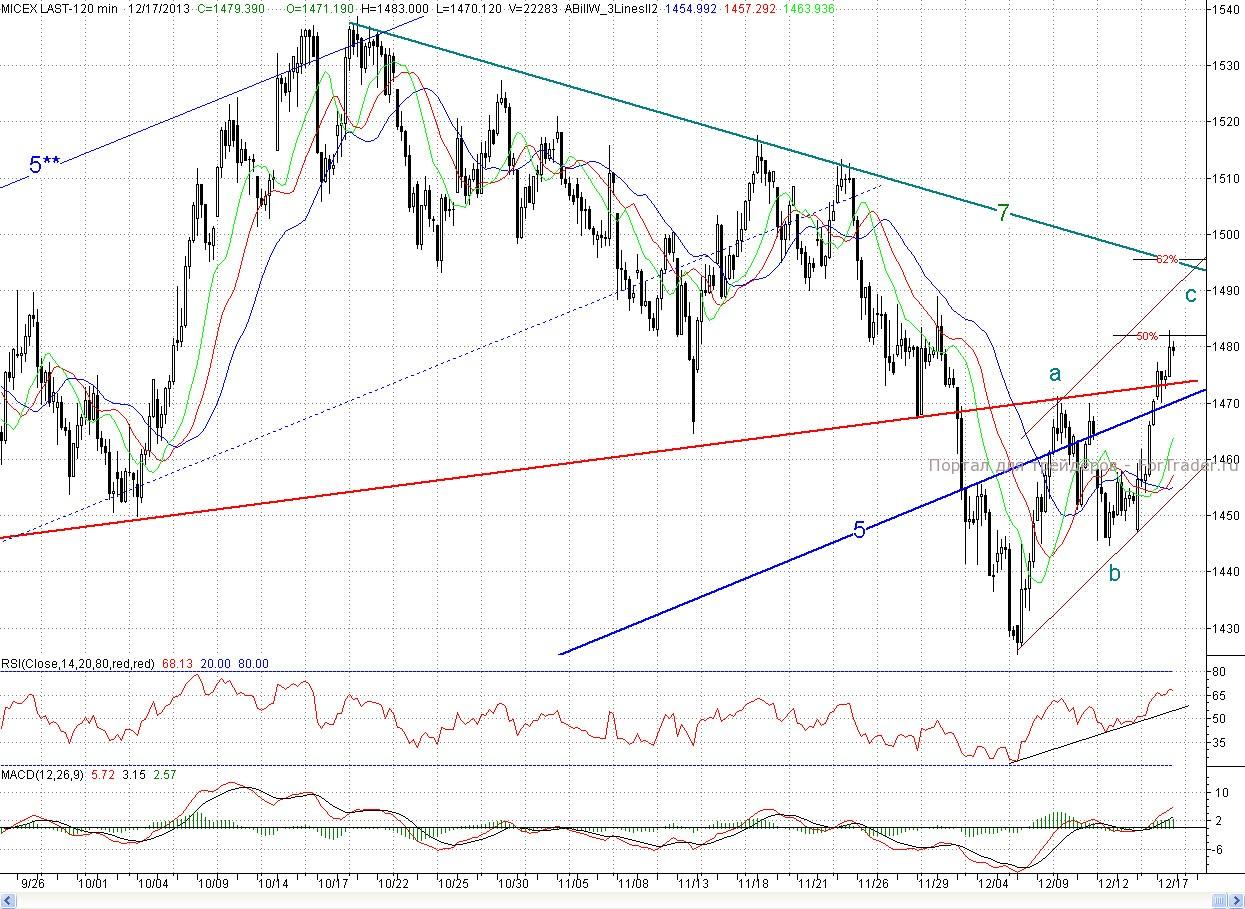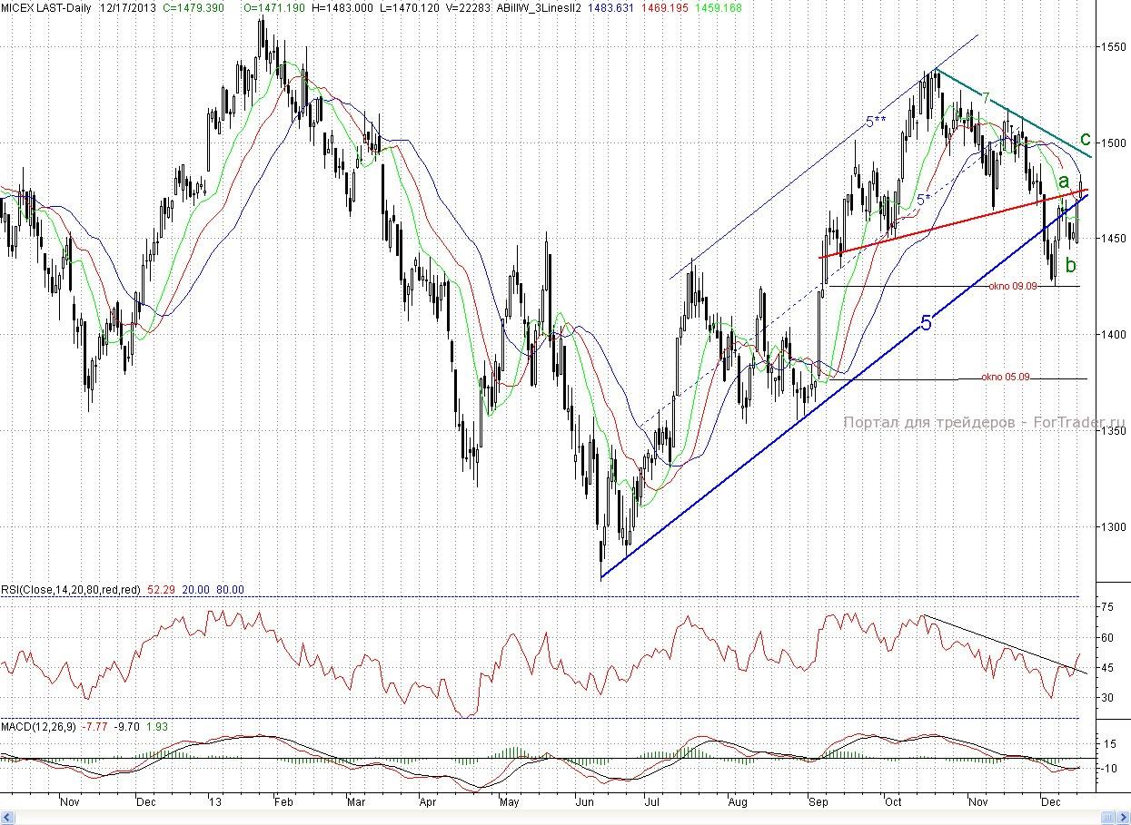 С технической точки зрения плюсом для них является то, что индекс ММВБ по дням по Б.Уильямсу вошел в покупку. Был пробит падающий тренд по индикатору RSI, а он аналогичен среднесрочному падающему тренду (7) на ценовом графике. А так как вышеназванный осциллятор действует с опережением, то с большой вероятностью котировки придут на данный тренд. К тому же медвежьи дивергенции отсутствуют, и там же расположена цель (~1 490 п.) растущей трехволновки a-b-c. А пока цены остановились на уровне 50% коррекции от падения с 21 октября. Так что быки могут сделать и перекур.