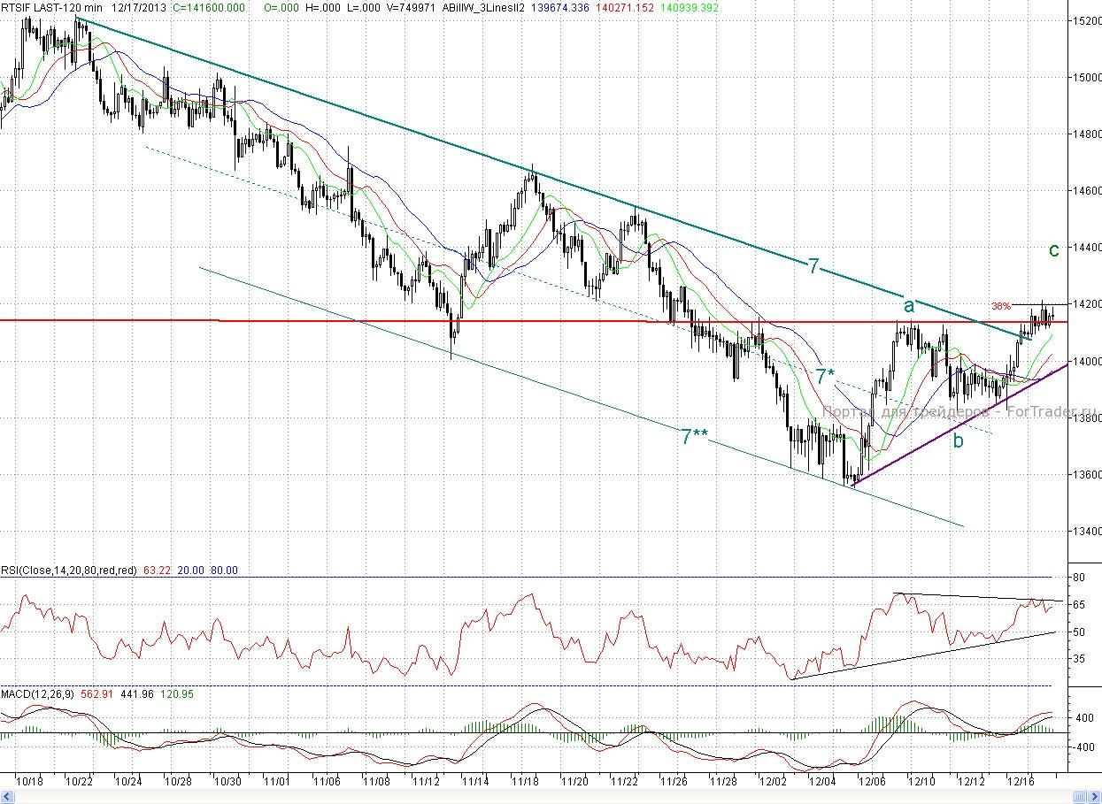 Однако на 2-часовом графике фьючерса на индекс РТС картина для покупателей не такая радостная. Несмотря на то, что и там был преодолен ключевой медвежий рубеж, но сильно развить свой успех быки пока не смогли, и уже образовались медвежьи дивергенции, как по RSI, так и по обоим MACDам. Да и общий рост там не такой сильный. Котировки застряли на уровне 38% коррекции от падения с 22 октября. Но целью аналогичной трехволновки a-b-c выступает район 144 000п. Там же расположен и уровень 50% коррекции.
