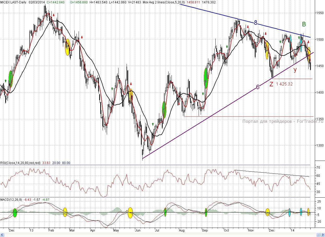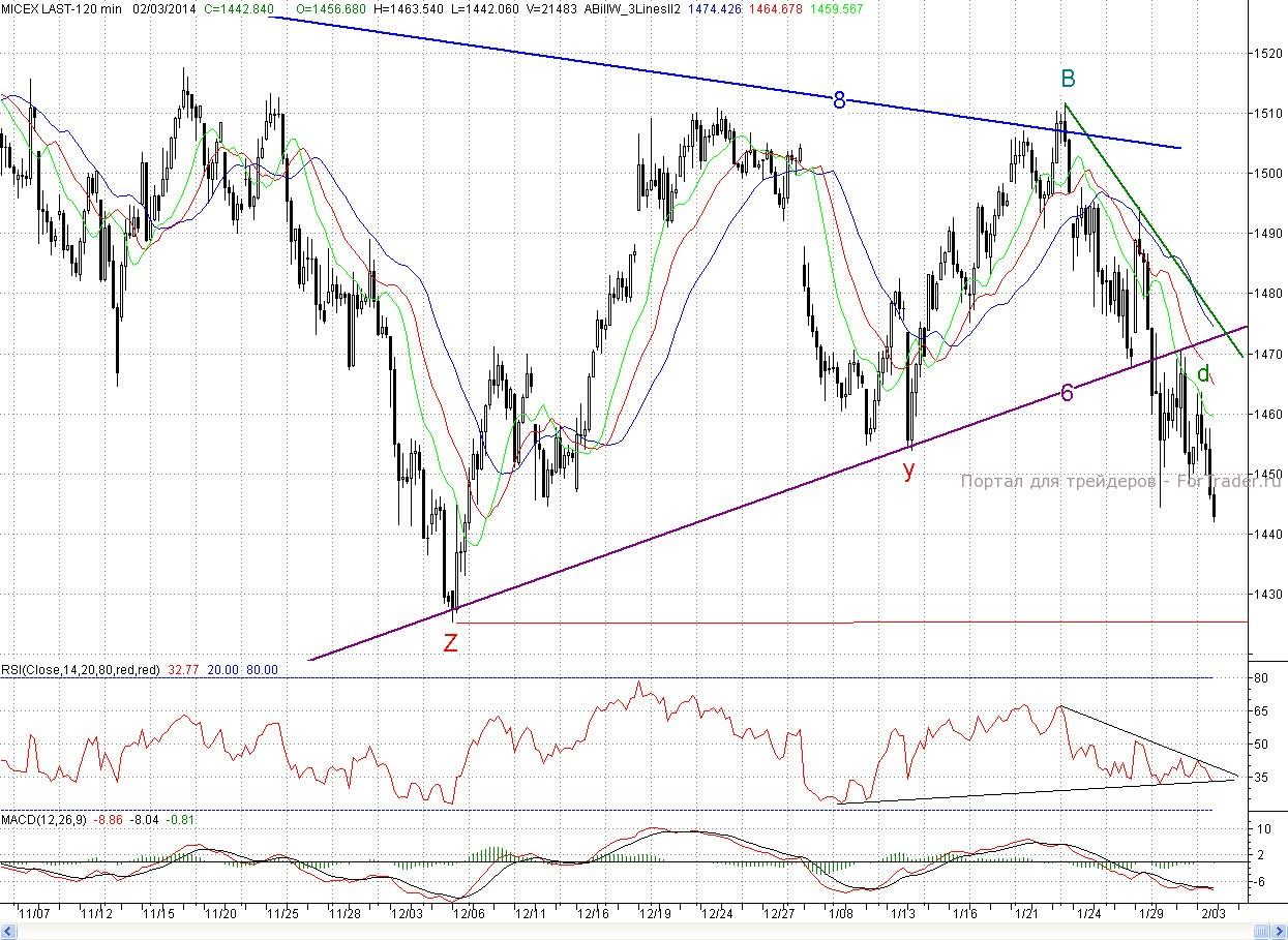 Таким образом, медвежий топор, занесенный над бычьими головушками в предыдущие дни начал резко опускаться. Еще 30 января, после того как был пробит тренд (6) было написано, что это печально, но не смертельно для покупателей. В дальнейшем события пошли по сценарию, который развивался в начале декабря прошлого года. Так что теперь пришла очередь вступить в бой и основному рубежу бычьей обороны в лице декабрьского минимума Z (1 425,32 п.), который является недельным фракталом на продажу. И если он не устоит, то подчеркну еще раз, это будет означать полное фиаско бычьего наступление с декабря прошлого года, так как в этом случае из- за не проторгованности ценового диапазона начала сентября, цены очень быстро придут на минимумы августа (~ 1 350 п.). Можно сказать, что сейчас покупатели стоят на краю, если не пропасти, то глубокого обрыва. И им необходимо приложить огромные усилия, чтобы не сорваться туда. Так что самое время вспоминать строчки из песни В. Цоя «Группа крови». Пожелаем и мы им удачи в бою.