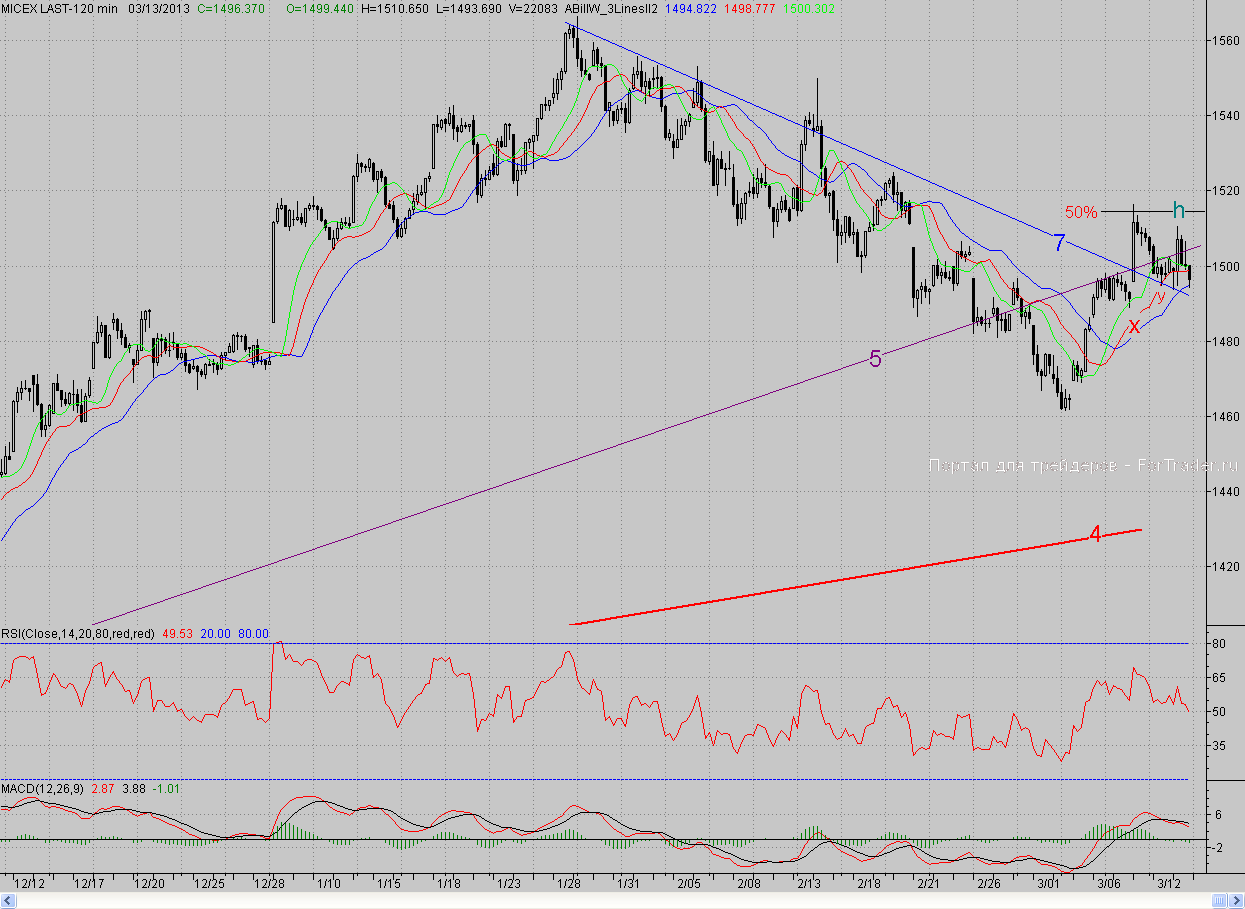 Исследуя 2-часовой график индекса ММВБ, видим, что открывшись на умеренно-негативном внешнем фоне с гэпом вниз, котировки продолжили снижение. Но 2-часовой фрактал на продажу Y (1494,9 п.) и среднесрочный падающий тренд (7) в целом справились со своей ролью поддержки. Так, хотя номинально фрактал Y и был проколот, «быки» сумели оттолкнуться от вышеуказанного района и пойти в контратаку, в результате чего, даже вернули себе старый среднесрочный растущий тренд (5). Однако, недолго они были хозяевами ситуации – поскольку свой оптимизм быстро закончился, а внешние рынки не спешили поддерживать покупателей. В результате «мишки» перехватили инициативу и возобновили давление. Тем не менее, утренний минимум выстоял, и день завершился лишь в умеренном минусе.