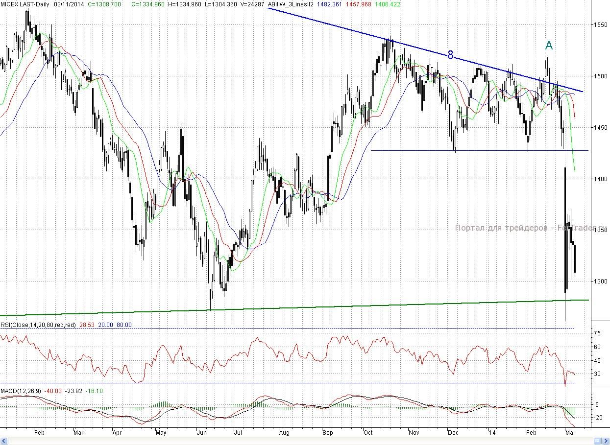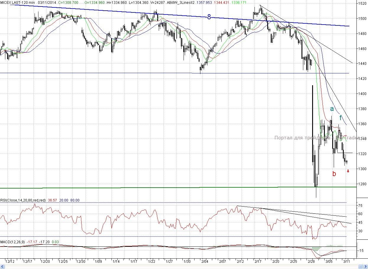 Исследуя 2-часовой график индекса ММВБ видим, что на негативном внешнем фоне, открывшись с гэпом вниз, котировки продолжили снижение. В районе ближайшей поддержки (пятничный минимум (1 322,1 п.)) быки попытались организовать оборону. Но после обеда данный редут не выстоял, и падение продолжилось. Цены встретили поддержку только в районе минимума четверга b (1 301,96 п.). В результате день завершился в существенном минусе (2,29%)