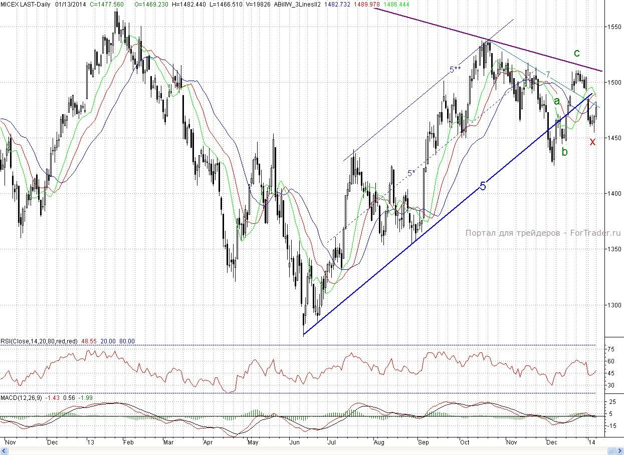 Таким образом, покупатели нашли в себе силы и продолжили контрнаступление. Однако, этот рост полноценным не выглядел. Как писалось вчера, он шел без растущей заходной волны, да и объемы торгов были невелики. И вечерняя сессия на ФОРТСе подтвердила это. Фьючерс на индекс РТС снизился более чем на 62% от предыдущего роста, что уже нежелательно для образования растущей волны. Так что теперь актуальной становится поддержка по индексу ММВБ в лице минимума пятницы Х (1 454,75 п.) и четверга Х (137 210 п.) по RIH4, которые и выступят ключевыми редутами. И быкам их необходимо удержать, иначе полуторадневный отскок тогда можно будет классифицировать как образование уже заходной падающей дневной волны, с целью падения на минимумы декабря. Так что наступил ключевой момент.