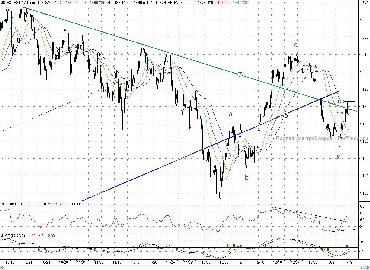 Исследуя 2-часовой график индекса ММВБ видим, что открывшись на том же уровне, дальнейшего роста не последовало. Но ближе к обеду бычьи настроения стали превалировать и котировки уверенно пошли вверх. Преодолеть ближайшее сопротивление — уровень 38% (~1 476 п.) коррекции от снижения с конца декабря и «старый» среднесрочный падающий тренд (7) у наступающих хватило сил, а вот следующий медвежий редут — уровень 50% (~1 482 п.) оказался быкам не по зубам. От него началась фиксация прибыли по краткосрочным лонгам, да шортисты активизировались. Тем не менее, закрытие произошло в неплохом плюсе (0,57%).
