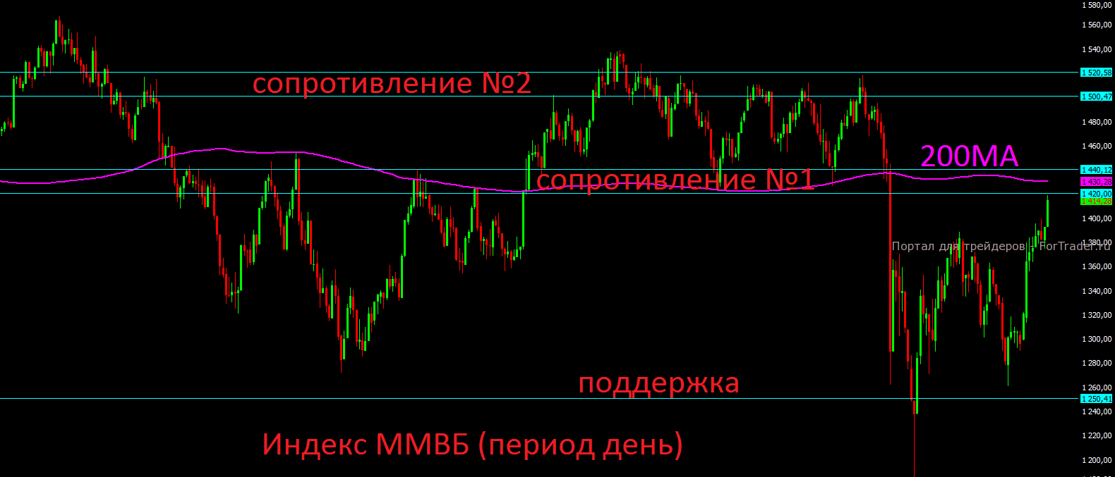 С технической точки зрения российский рублёвый индекс ММВБ практически закрыл весь мартовский обвал и достиг важной зоны сопротивления 1420-1440 пунктов, внутри которой проходит и 200 дневная скользящая средняя. До конца предстоящей недели данный диапазон вряд ли будет пробит вверх, а вот после выборов на Украине, уже 26 числа, возможно всё. В любом случае, максимальные отметки роста на июнь, или до начала новой коррекции, находятся в диапазоне 1500-1520 пунктов.