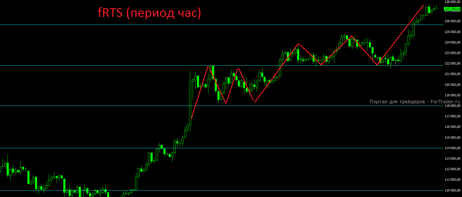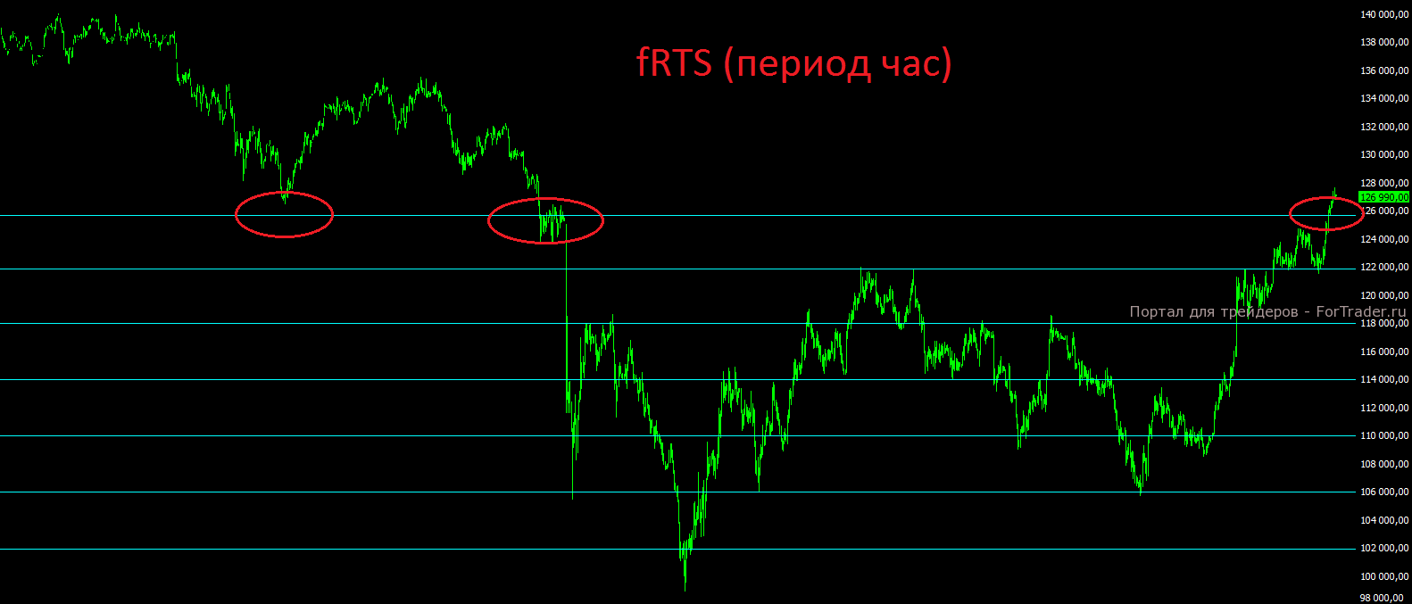 Фьючерс на индекс РТС всю прошлую неделю уверенно держался выше отметки 122000, что предвещало поход к отметке 126000. После двух ложных заходов вниз для набора топлива на прошлой неделе, мы в понедельник, наконец увидели выход вверх. Продолжится ли бычий импульс во вторник будет зависть от новостей из Китая, но пока цена удерживается выше отметки 126000, шансов на рост пока больше и никаких сигналов для открытия коротких позиций пока нет. Фьючерс на индекс РТС полностью закрыл гэп “чёрного понедельника”, но пока это не повод для разворота обратно вниз. Ближайшая поддержка находится на отметке 126000 пунктов, ближайшая цель роста на отметке 130000 пунктов. Говорить об уверенном развороте и о начале коррекции можно будет только при пробое вниз отметки 122000 пунктов.