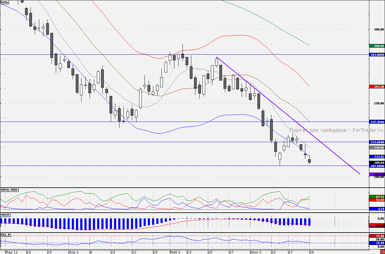 В свете понижения прогноза роста экономики Китая со стороны банка Goldman Sachs, сегодня динамику хуже рынка демонстрируют акции «Северстали». Бумаги устремились вниз к годовому минимуму 207,60 руб. При тестировании данной отметки стоит быть осторожными с удержанием коротких позиций. Так, в случае если «быкам» удастся перехватить инициативу в свои руки, то на графике акций возможно формирование фигуры разворота «двойное дно», с целью возвращения к линии «шеи» на отметке 229,60 руб. Однако, судя по показаниям трендовых индикаторов, развитие позитивного сценария маловероятно. В частности индикатор ADMI/ADX показывает, что преимущество пока на стороне продавцов (линия «медведей» находится выше линии «быков»). Таким образом, короткие позиции стоит удерживать с целью достижения годового минимума на отметке 207,60 руб. Наш 30-минутный торговый робот находится в «шортах», удерживая короткие позиции от отметки 216,00 руб.
