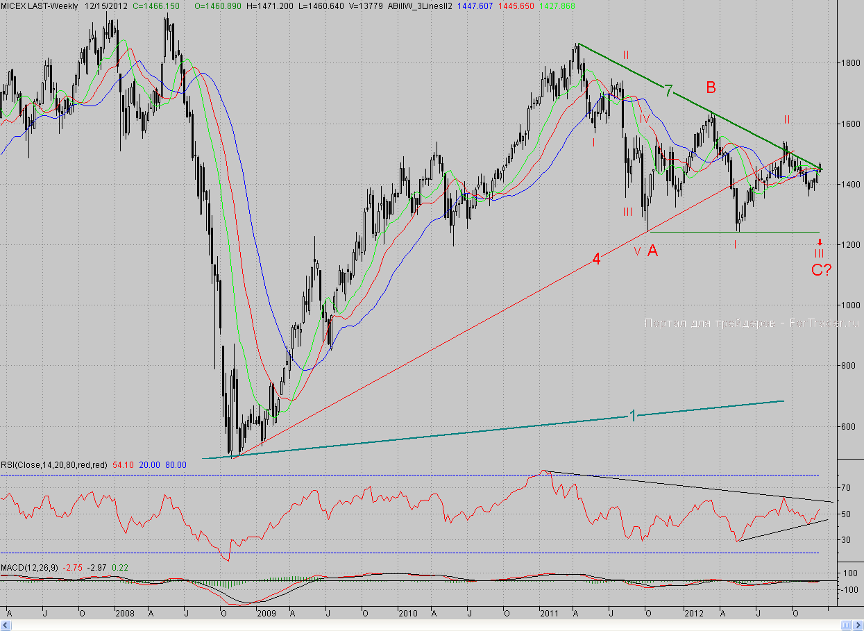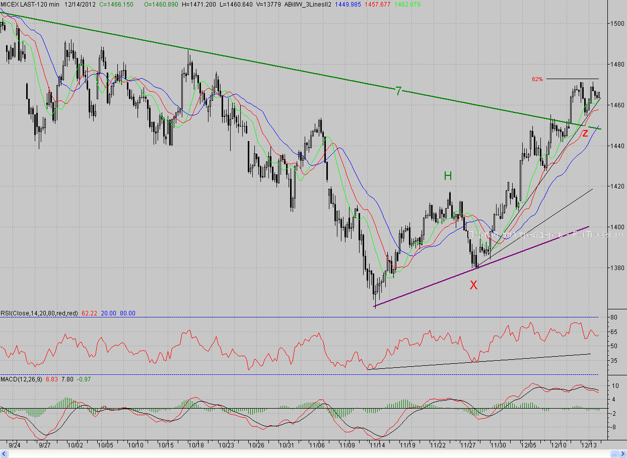Однако и про «медведей» не стоит забывать, ведь они тоже научились быть хитрыми и под занавес года могут устроить сюрприз. И если это не будет падение, то, по крайней мере, и дальнейшего роста может не быть. К тому же совсем не вдохновляют недельные свечи по основным американским индексам («вечерняя звезда») – а это значит, что заокеанский трёхнедельный рост вполне может оказаться отскоком к падению, начавшемуся в середине октября. И, если это так, то российским «быкам» будет очень сложно продолжать поход на Север. Про сопротивление мы уже упомянули, что же касается поддержки, то на сегодня ближайшей будет пятничный вечерний минимум и краткосрочный растущий тренд, а далее – 2-часовой фрактал на продажу Z (1454,6 п.). Более серьёзным редутом «бычьей» обороны является преодоленный неделей ранее долгосрочный падающий тренд (7) (~1445 п.).
