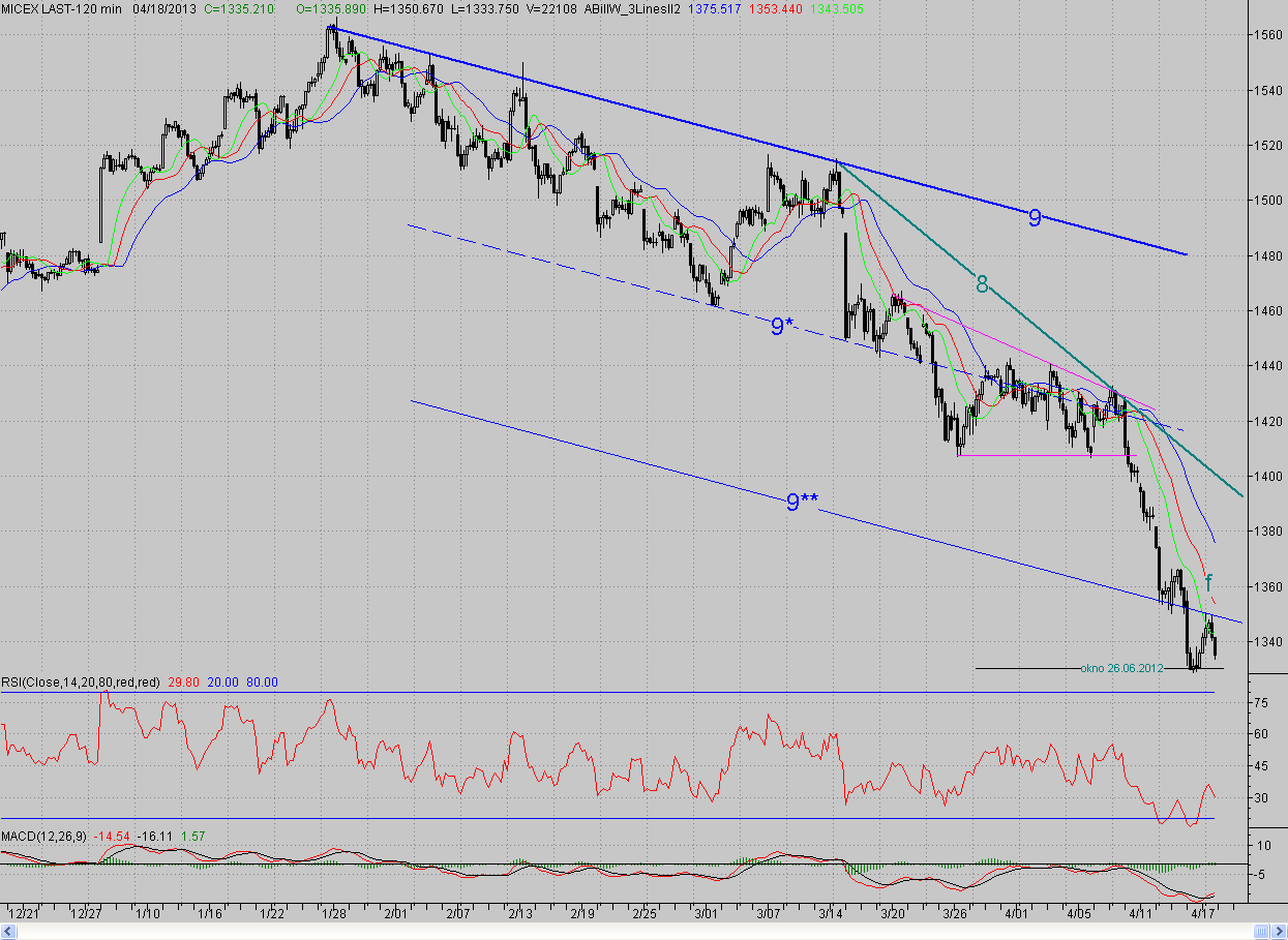 Исследуя 2-часовой график индекса ММВБ, видим, что открывшись на тех же уровнях, котировки продолжили отскок, начавший формироваться днём ранее. Но, видимо, избиения предыдущих дней настолько лишили «быков» сил, что цены не смогли справиться с ближайшим сопротивлением в лице нижней границы среднесрочного падающего канала (9-9**), хотя дважды атаковали этот рубеж. «Медведи», видя такую ситуацию, не преминули воспользоваться нерешительностью «быков» и снова погнали их вниз, правда продажи на этот раз были менее агрессивные, и день закрылся в «нуле».