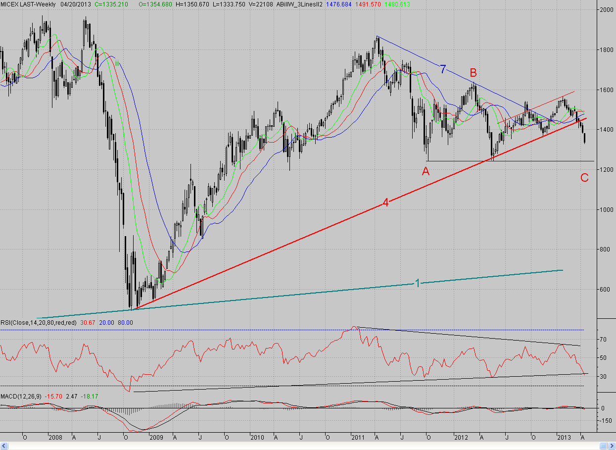 Сегодня заключительный день торговой недели, и она закрывается снова плохо для «быков» — рынок падает уже 11 недель (учитывая небольшой отскок в марте), и падение ускорилось. А так как был преодолен ноябрьский минимум, то теперь у покупателей осталась надежда на район полуторагодовых минимумов (~1240 п.). Однако шансы подсластить пилюлю и сформировать предпосылки для отскока у покупателей всё же есть. Но для этого быкам сегодня надо проявить чудеса героизма, чтобы котировки выросли на ~2,5%. Вчера героем покупателей был ГМК Норильский Никель. Но для того, чтобы весь рынок хорошо вырос, должны пойти вверх и другие ликвидные акции. Правда, найдутся ли в бычьем войске новые герои, ещё вопрос.