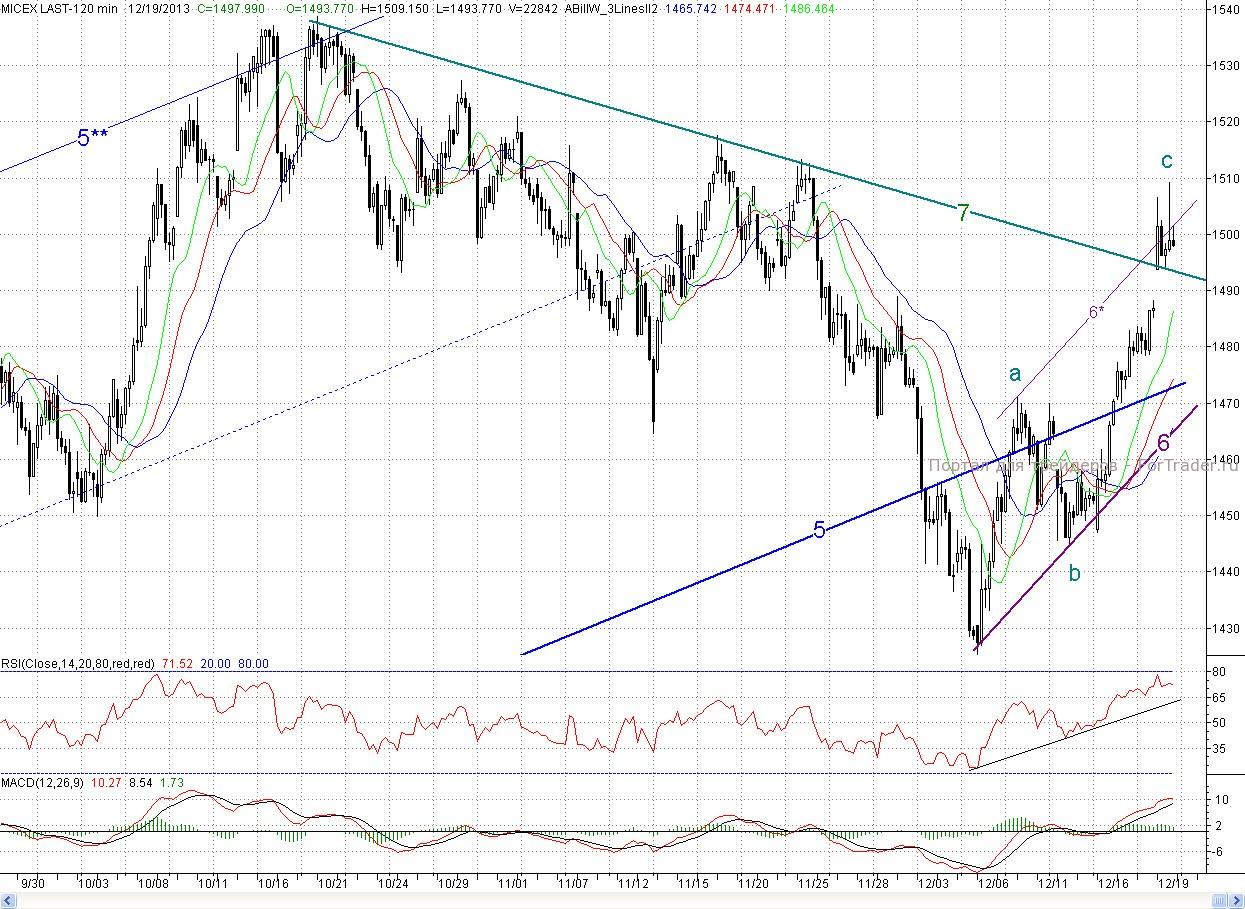 С технической точки зрения плюсом для покупателей является то, медвежьих дивергенции на 2-часовом графике на индекс ММВБ нет, а на фьючерсе на индекс РТС они вчера были сломаны, а новые еще не образованы. Однако котировки дважды отражались от верхней границы краткосрочного растущего канала (6-6*) (фьючерс на индекс РТС). Так что велика вероятность и отката. Хотя после того, как цены преодолели первую расчетную цель роста трехволновки a-b-c (~144 000п.), то новой целью выступает район 147 700п. (длина волны С с расширением 1,62 от длины волны А) По индексу ММВБ это ~1 520п.