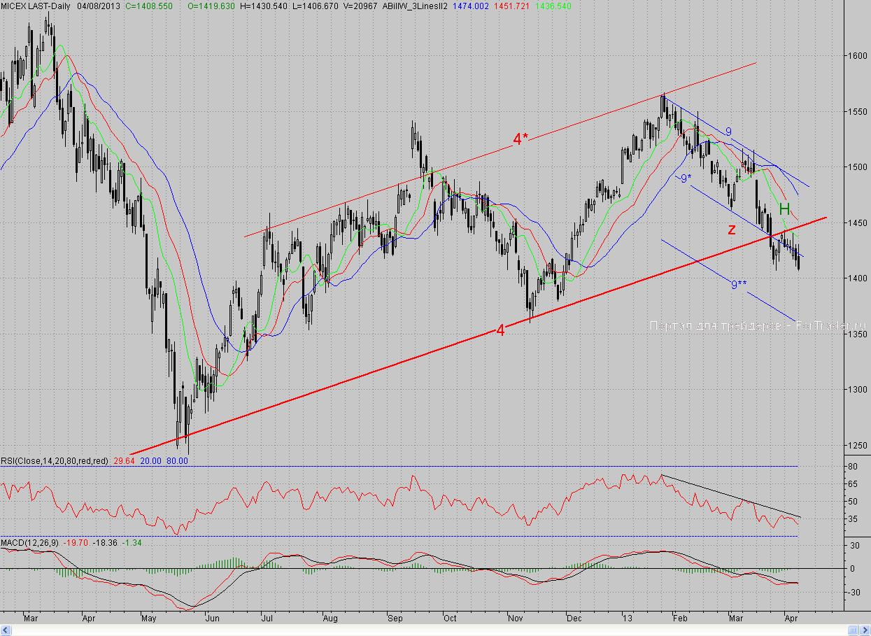 Исследуя 2-часовой график индекса ММВБ, видим, что на умеренно-позитивном внешнем фоне котировки открылись с гэпом вверх и продолжили рост, в результате чего без особого труда преодолели ближайшее сопротивление в лице средней линии (9*) среднесрочного падающего канала (9-9**). Тем не менее, недолго «бычья музыка играла», и менее чем через час покупательский запал иссяк, и цены остановились в районе утренних максимумов пятницы (~1430 п.) – и это несмотря на то, что и фьючерсы на американские индексы находились на дневных максимумах, и нефть начала отрастать. «Медведи» же, видя нерешительность «быков», не стали терять время и сами перешли в наступление, преодолев не только линию (9*) и закрыв утреннее окно, но и уйдя в более южные области. И только район предыдущего локального минимума, а также окончание торгов остановили покупателей от дальнейшего избиения.