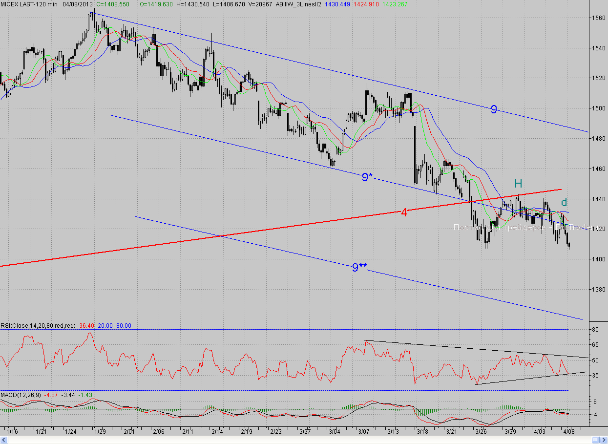 Однако не всё так просто для них, ведь объёмы торгов на вчерашнем падении уменьшились, что говорит о том, что «рука бойца колоть устала». К тому же вчера сформировались хорошие потенциальные дивергенции по дневному и 2-часовому графикам. Так что есть все предпосылки для неплохого отскока. В этом случае ближайшим сопротивлением будет средняя линия канала (9-9**), а далее – вчерашний максимум, который стал новым 2-часовым фракталом на покупку d (1430,5 п.). Ключевым редутом «медвежьей» обороны остаётся дневной сигнал Н (1442 п.) и долгосрочный растущий тренд (4).