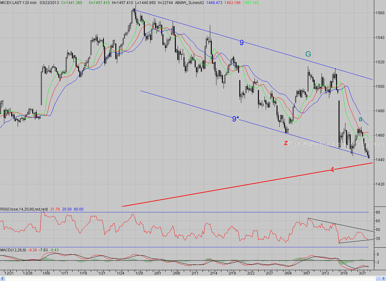 Исследуя 2-часовой график индекса ММВБ, видим, что открывшись на умеренно-негативном внешнем фоне с гэпом вниз, котировки продолжили падение. Уровень 62%-ной коррекции от роста последних двух дней (1452 п.) попытался приостановить снижение, однако сил у «быков» не хватило, и он достаточно быстро был преодолен. И только район предыдущего локального минимума и нижней границы среднесрочного падающего канала (9-9*) сумели остановить «медведей». В результате закрытие произошло на дневном минимуме, и цены лишь немного не дошли до основной поддержки в лице долгосрочного растущего тренда (4), про который мы пишем последнее время.