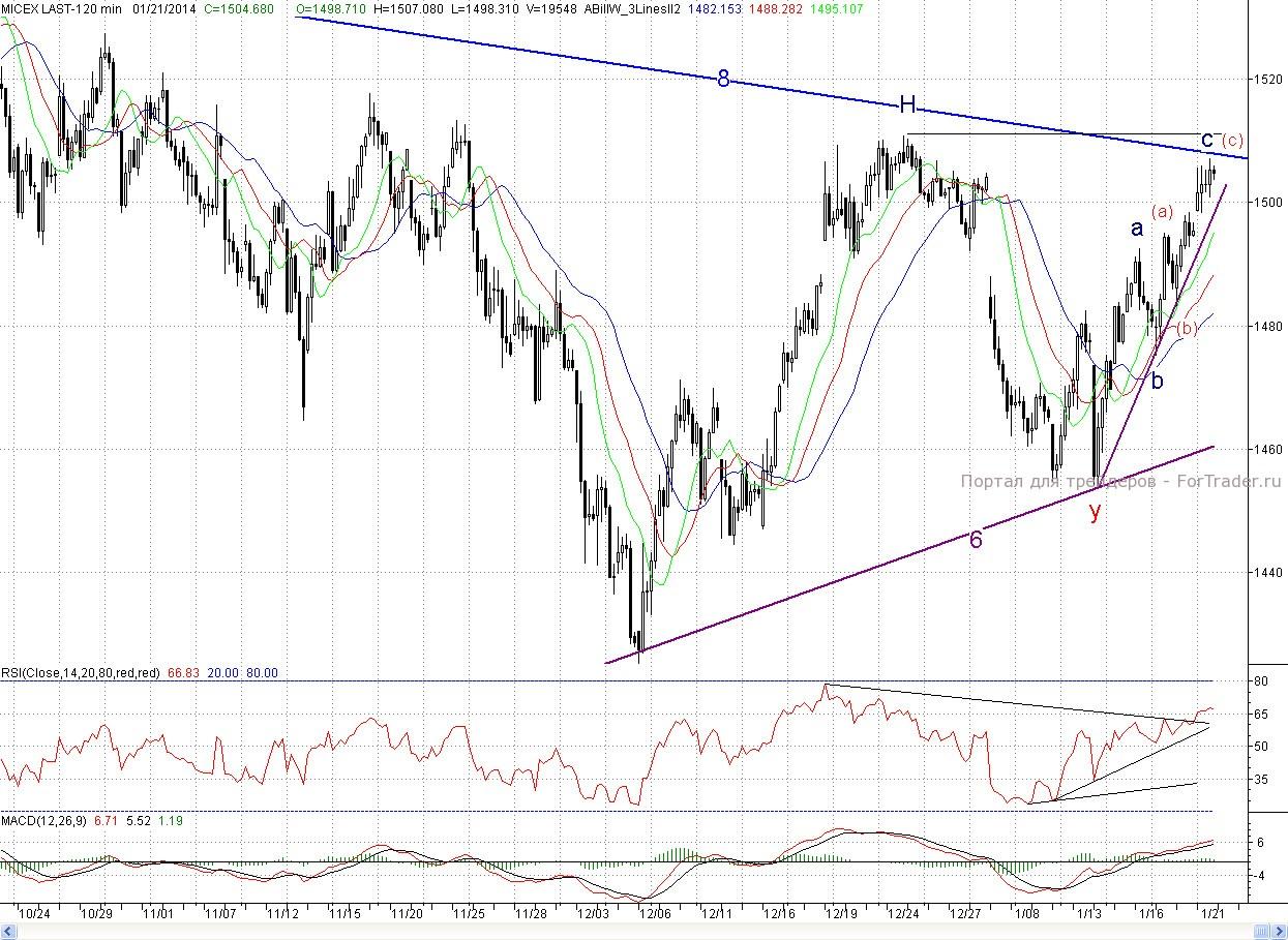К тому же картина на фьючерс на индекс РТС, из- за продолжающегося ослабления рубля пока не радостна для покупателей. Вчера на вечерней сессии ФОРТС нижняя грань предполагаемого треугольника была немного расширена. Но ситуация там по прежнему остается неопределенной. Однако выход из данной конфигурации произойдет в ближайшее время. На сегодня роль ближайшей поддержки сыграет краткосрочный растущий тренд, а далее вчерашнее незакрытое окно (~1 495 п.) Более сильным редутом будет минимум понедельника (b) (1 483, 25 п.).