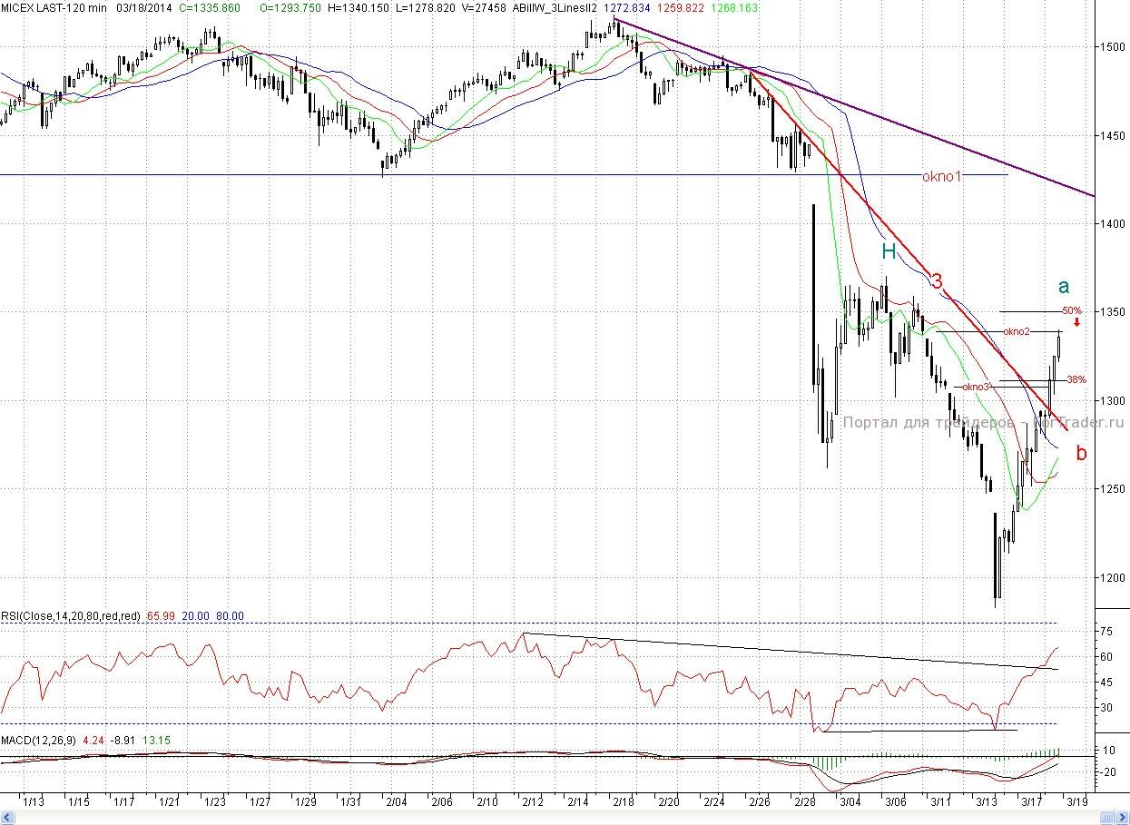 Исследуя 2-часовой график индекса ММВБ видим, что на позитивном внешнем фоне открывшись с небольшим гэпом вверх, дальнейшего роста сразу не последовало. Но после обеда, оптимизм в преддверии выступления президента РФ Путина В.В. по ситуации в Крыму стал преобладать, и покупки возобновились.